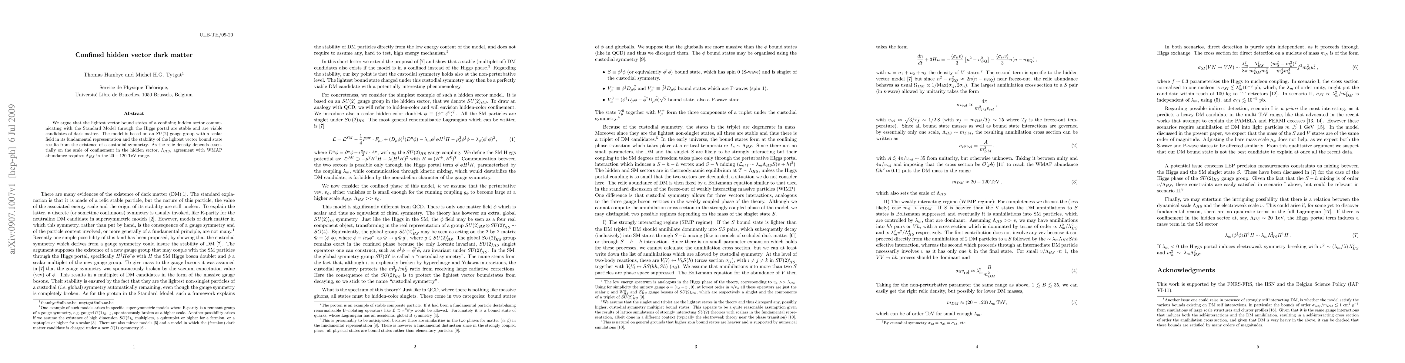 This paper proposes that the lightest vector bound states in a confining hidden sector, interacting with the Standard Model via the Higgs portal, can be stable dark matter candidates. The model's viability hinges on an SU(2) gauge group and a custodial symmetry, with the relic density aligning with WMAP data when the confinement scale, Lambda_HS, is in the 20-120 TeV range.