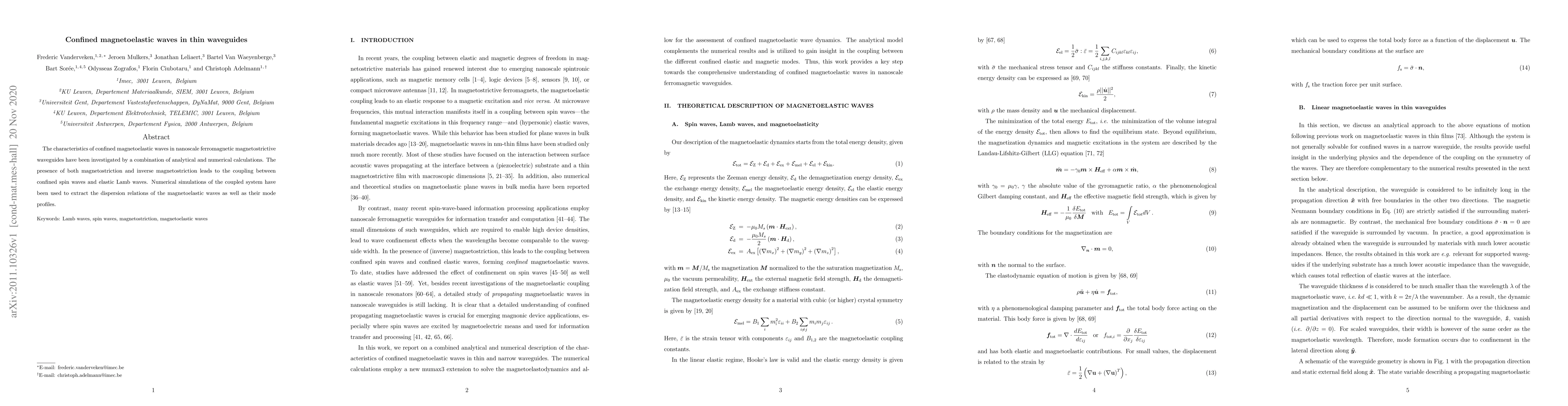 This paper investigates the behavior of confined magnetoelastic waves in nanoscale ferromagnetic waveguides using analytical and numerical methods, revealing the coupling between spin waves and elastic Lamb waves due to magnetostriction effects. Numerical simulations provide insights into the dispersion relations and mode profiles of these coupled magnetoelastic waves.