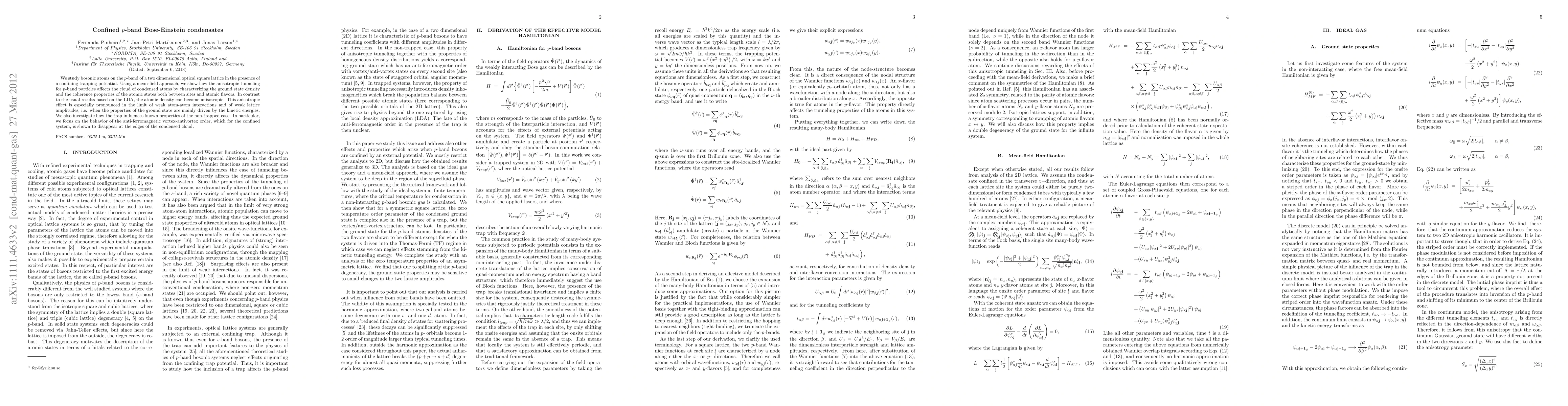 We study bosonic atoms on the p-band of a two dimensional optical square lattice in the presence of a confining trapping potential. Using a mean-field approach, we show how the anisotropic tunneling for p-band particles affects the cloud of condensed atoms by characterizing the ground state density and the coherence properties of the atomic states both between sites and atomic flavors. In contrast to the usual results based on the local density approximation, the atomic density can become anisotropic. This anisotropic effect is especially pronounced in the limit of weak atom-atom interactions and of weak lattice amplitudes, i.e. when the properties of the ground state are mainly driven by the kinetic energies. We also investigate how the trap influences known properties of the non-trapped case. In particular, we focus on the behavior of the anti-ferromagnetic vortex-antivortex order, which for the confined system, is shown to disappear at the edges of the condensed cloud.