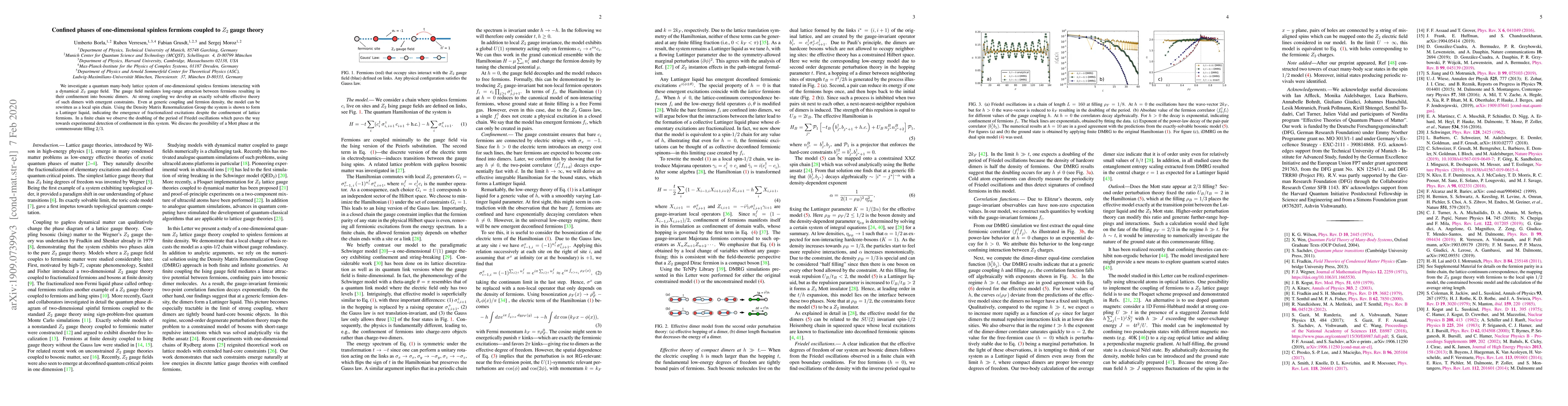 We investigate a quantum many-body lattice system of one-dimensional spinless fermions interacting with a dynamical $Z_2$ gauge field. The gauge field mediates long-range attraction between fermions resulting in their confinement into bosonic dimers. At strong coupling we develop an exactly solvable effective theory of such dimers with emergent constraints. Even at generic coupling and fermion density, the model can be rewritten as a local spin chain. Using the Density Matrix Renormalization Group the system is shown to form a Luttinger liquid, indicating the emergence of fractionalized excitations despite the confinement of lattice fermions. In a finite chain we observe the doubling of the period of Friedel oscillations which paves the way towards experimental detection of confinement in this system. We discuss the possibility of a Mott phase at the commensurate filling $2/3$.