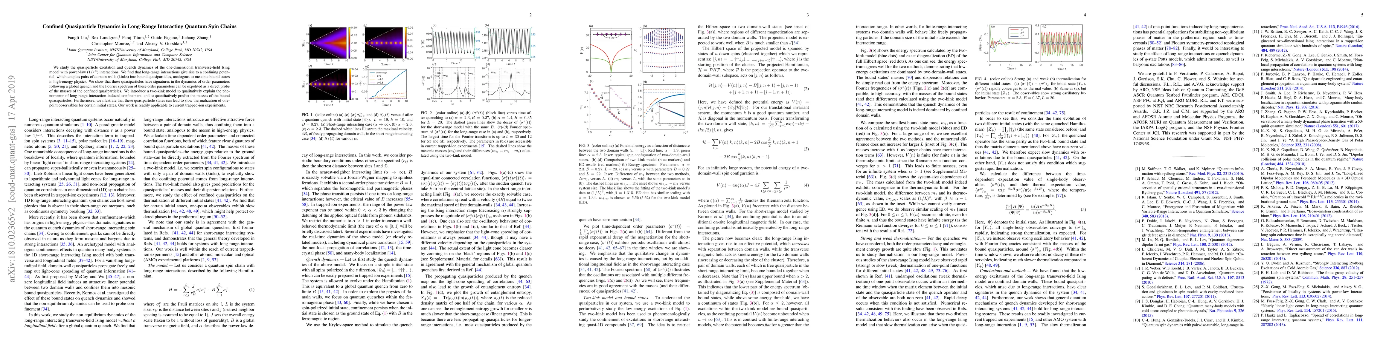 This paper investigates the quasiparticle dynamics in long-range interacting quantum spin chains, revealing that such interactions create a confining potential that binds domain walls into quasiparticles akin to mesons. The study demonstrates that these quasiparticles can be probed through the dynamics and Fourier spectrum of order parameters post-quench, and highlights their role in slow thermalization.