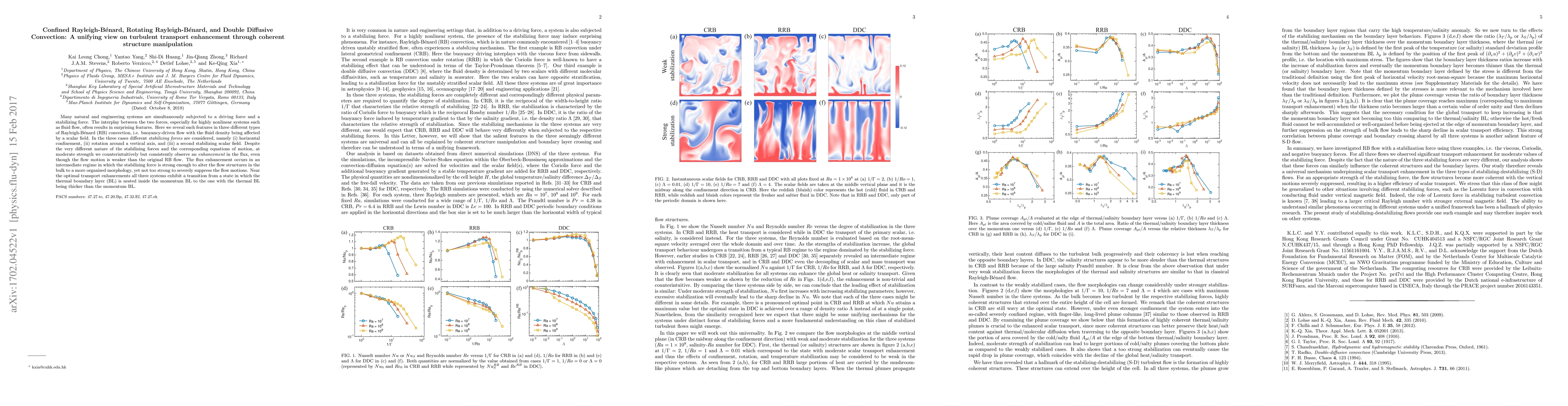 Many natural and engineering systems are simultaneously subjected to a driving force and a stabilizing force. The interplay between the two forces, especially for highly nonlinear systems such as fluid flow, often results in surprising features. Here we reveal such features in three different types of Rayleigh-B\'enard (RB) convection, i.e. buoyancy-driven flow with the fluid density being affected by a scalar field. In the three cases different {\it stabilizing forces} are considered, namely (i) horizontal confinement, (ii) rotation around a vertical axis, and (iii) a second stabilizing scalar field. Despite the very different nature of the stabilizing forces and the corresponding equations of motion, at moderate strength we counterintuitively but consistently observe an {\it enhancement} in the flux, even though the flow motion is weaker than the original RB flow. The flux enhancement occurs in an intermediate regime in which the stabilizing force is strong enough to alter the flow structures in the bulk to a more organised morphology, yet not too strong to severely suppress the flow motions. Near the optimal transport enhancements all three systems exhibit a transition from a state in which the thermal boundary layer (BL) is nested inside the momentum BL to the one with the thermal BL being thicker than the momentum BL.