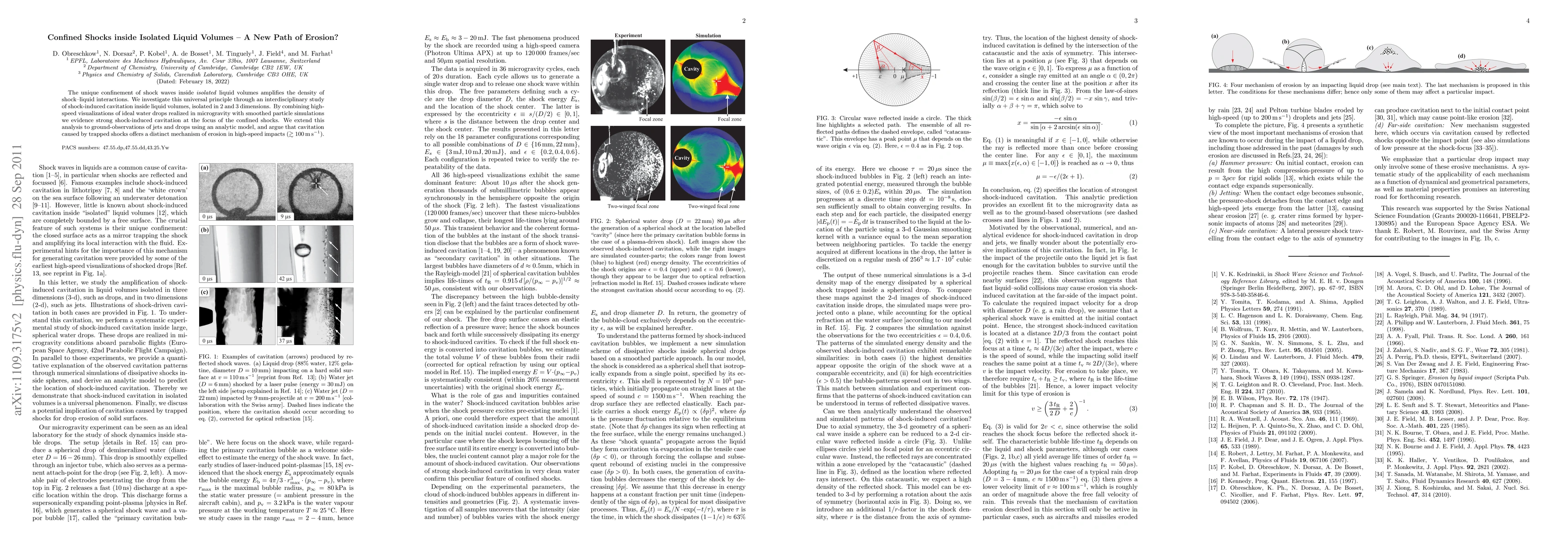 The unique confinement of shock waves inside isolated liquid volumes amplifies the density of shock-liquid interactions. We investigate this universal principle through an interdisciplinary study of shock-induced cavitation inside liquid volumes, isolated in 2 and 3 dimensions. By combining high-speed visualizations of ideal water drops realized in microgravity with smoothed particle simulations we evidence strong shock-induced cavitation at the focus of the confined shocks. We extend this analysis to ground-observations of jets and drops using an analytic model, and argue that cavitation caused by trapped shocks offers a distinct mechanism of erosion in high-speed impacts (>100 m/s).