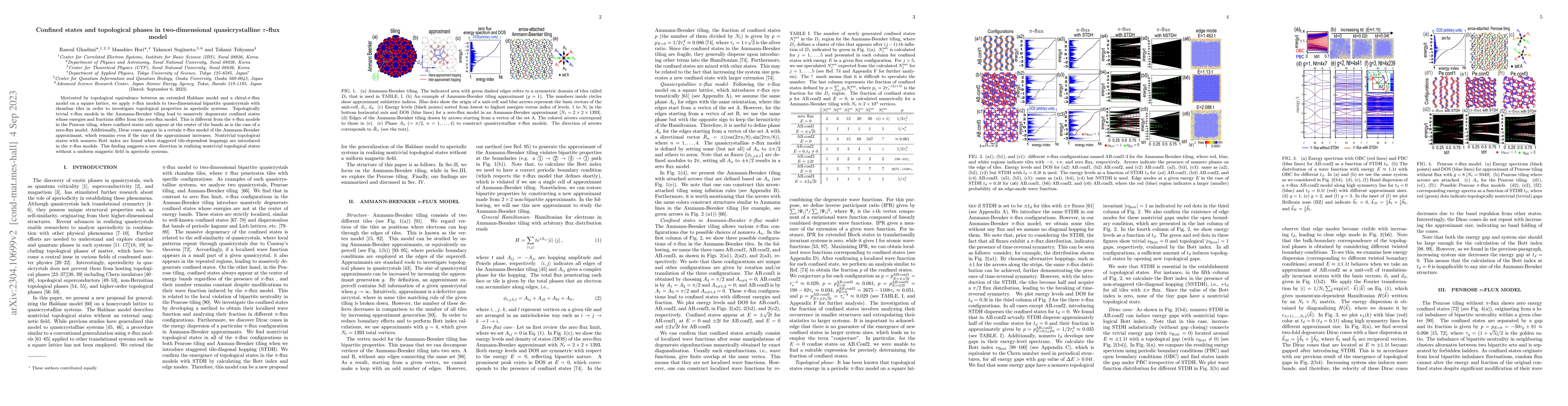 Motivated by topological equivalence between an extended Haldane model and a chiral-$\pi$-flux model on a square lattice, we apply $\pi$-flux models to two-dimensional bipartite quasicrystals with rhombus tiles in order to investigate topological properties in aperiodic systems. Topologically trivial $\pi$-flux models in the Ammann-Beenker tiling lead to massively degenerate confined states whose energies and fractions differ from the zero-flux model. This is different from the $\pi$-flux models in the Penrose tiling, where confined states only appear at the center of the bands as is the case of a zero-flux model. Additionally, Dirac cones appear in a certain $\pi$-flux model of the Ammann-Beenker approximant, which remains even if the size of the approximant increases. Nontrivial topological states with nonzero Bott index are found when staggered tile-dependent hoppings are introduced in the $\pi$-flux models. This finding suggests a new direction in realizing nontrivial topological states without a uniform magnetic field in aperiodic systems.