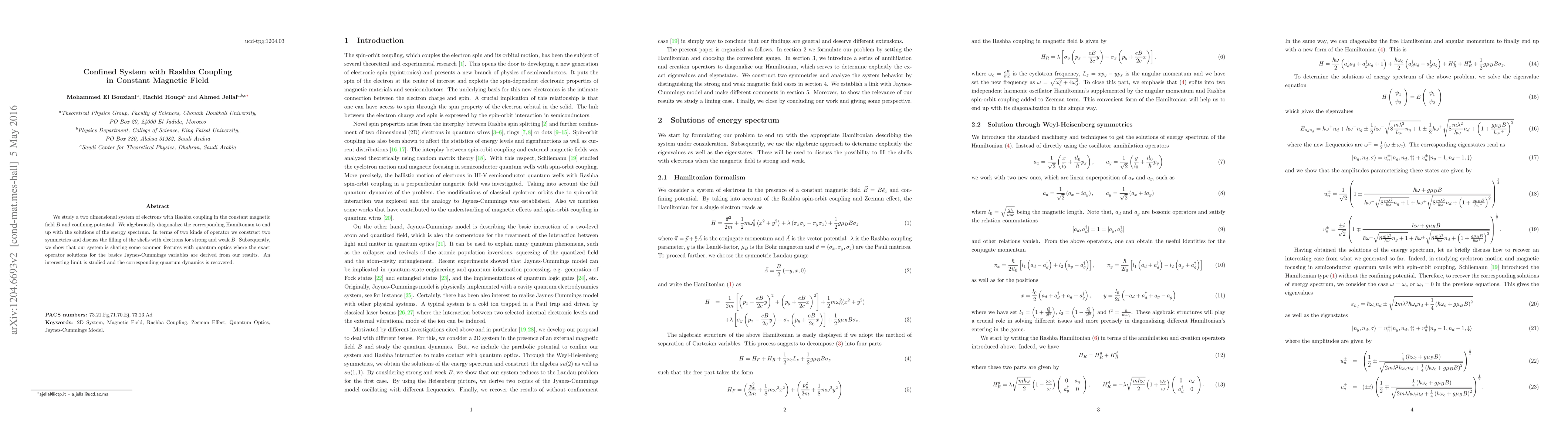 We study a two dimensional system of electrons with Rashba coupling in the constant magnetic field $B$ and confining potential. We algebraically diagonalize the corresponding Hamiltonian to end up with the solutions of the energy spectrum. In terms of two kinds of operator we construct two symmetries and discuss the filling of the shells with electrons for strong and weak $B$. Subsequently, we show that our system is sharing some common features with quantum optics where the exact operator solutions for the basics Jaynes-Cummings variables are derived from our results. An interesting limit is studied and the corresponding quantum dynamics is recovered.