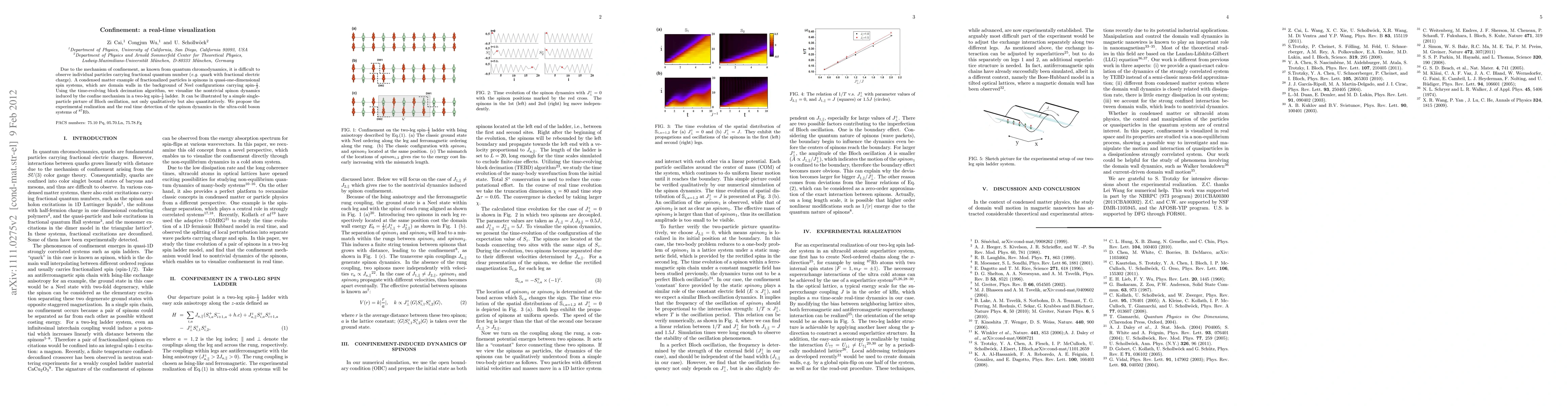 Due to the mechanism of confinement, as known from quantum chromodynamics, it is difficult to observe individual particles carrying fractional quantum number (e.g. quark with fractional electric charge). A condensed matter example of fractionalized particles is spinons in quasi-one-dimensional spin systems, which are domain walls in the background of Neel configurations carrying spin-1/2. Using the time-evolving block decimation algorithm, we visualize the nontrivial domain wall dynamics induced by the confine mechanism in a two-leg spin-1/2 ladder. It can be illustrated by a simple single-particle picture of Bloch oscillation, not only qualitatively but also quantitatively. We propose the experimental realization and the real time detection of the domain wall dynamics in the ultra-cold boson systems of $^{87}$Rb.