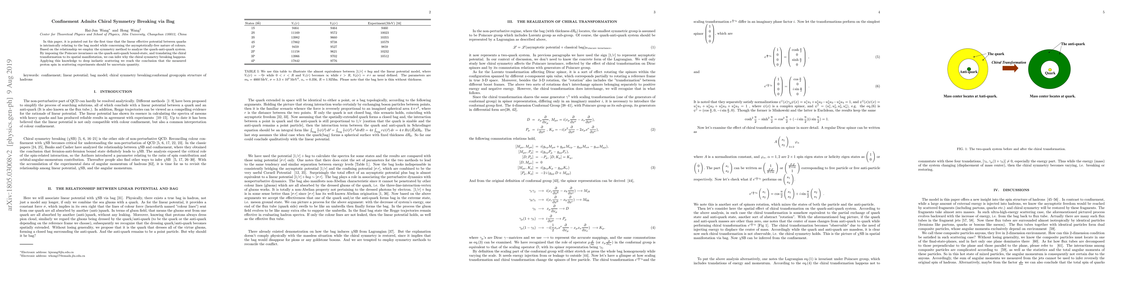 In this paper, it is pointed out for the first time that the linear effective potential between quarks is intrinsically relating to the bag model while concerning the asymptotically-free nature of colours. Based on the relationship we employ the symmetry method to analyze the quark-anti-quark system. For the tight bound system, one of the quark and anti-quark becomes the bag itself. By imposing the Poincare invariance on the quark-anti-quark bound-state, and translating the chiral transformation to its spatial manifestation, we can infer why the chiral symmetry breaking happens. Applying this knowledge to deep inelastic scattering we reach the conclusion that the measured proton spin in scattering experiments should be uncertain quantity.