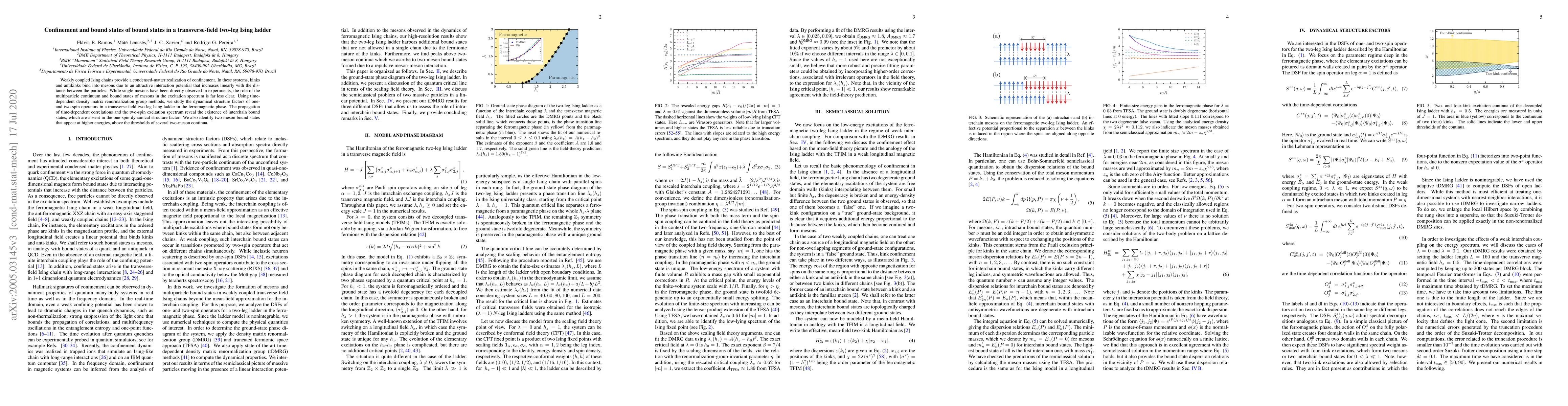 Weakly coupled Ising chains provide a condensed-matter realization of confinement. In these systems, kinks and antikinks bind into mesons due to an attractive interaction potential that increases linearly with the distance between the particles. While single mesons have been directly observed in experiments, the role of the multiparticle continuum and bound states of mesons in the excitation spectrum is far less clear. Using time-dependent density matrix renormalization group methods, we study the dynamical structure factors of one- and two-spin operators in a transverse-field two-leg Ising ladder in the ferromagnetic phase. The propagation of time-dependent correlations and the two-spin excitation spectrum reveal the existence of interchain bound states, which are absent in the one-spin dynamical structure factor. We also identify two-meson bound states that appear at higher energies, above the thresholds of several two-meson continua.