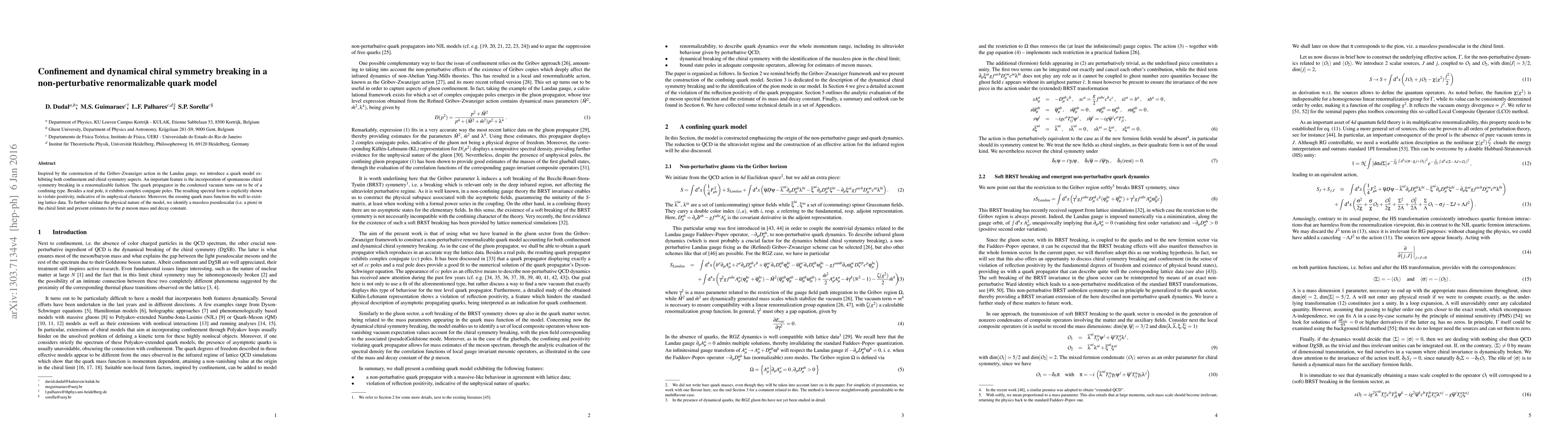 Inspired by the construction of the Gribov-Zwanziger action in the Landau gauge, we introduce a quark model exhibiting both confinement and chiral symmetry aspects. An important feature is the incorporation of spontaneous chiral symmetry breaking in a renormalizable fashion. The quark propagator in the condensed vacuum turns out to be of a confining type. Besides a real pole, it exhibits complex conjugate poles. The resulting spectral form is explicitly shown to violate positivity, indicative of its unphysical character. Moreover, the ensuing quark mass function fits well to existing lattice data. To further validate the physical nature of the model, we identify a massless pseudoscalar (i.e. a pion) in the chiral limit and present estimates for the rho meson mass and decay constant.