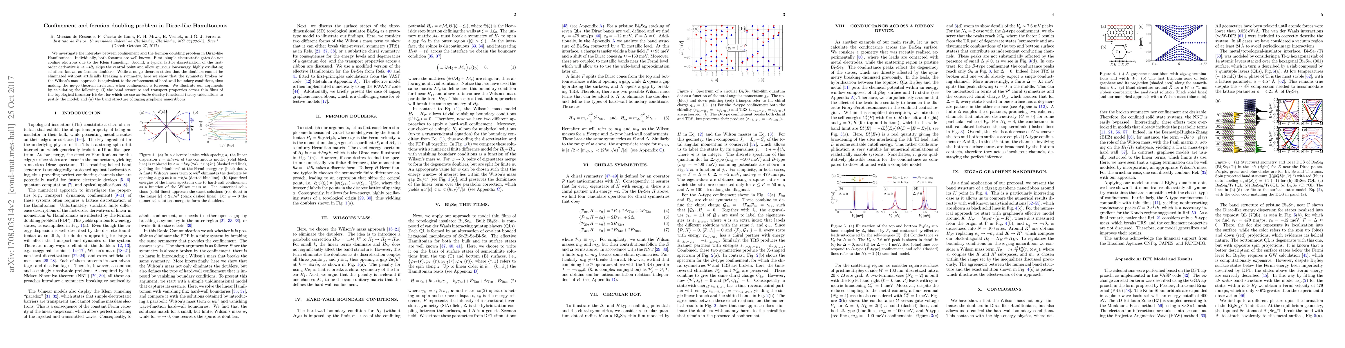 This paper explores how confinement can resolve the fermion doubling problem in Dirac-like Hamiltonians, demonstrating that the symmetry breaking in the Wilson's mass approach enforces hard-wall boundary conditions, thus overcoming the no-go theorem. It uses ab-initio calculations to analyze the band structure and transport properties of Bi$_2$Se$_3$ thin films and zigzag graphene nanoribbons.