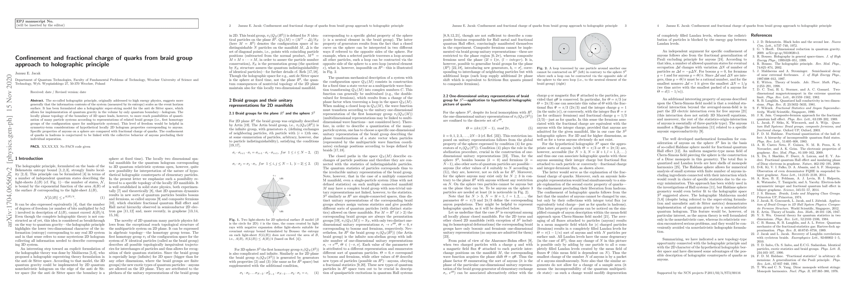 The so-called holographic principle, originally addressed to high energy physics, suggests more generally that the information contents of the system (measured by its entropy) scales as the event horizon surface. It has been formulated also a holographic super-string model for the anti de Sitter space, which allows for implementation of quantum gravity in the volume by only quantum boundary---hologram. The locally planar topology of the boundary of 3D space leads, however, to more reach possibilities of quantization of many particle systems according to representations of related braid groups (i.e., first homotopy groups of the configuration space for multiparticle systems). This level of freedom would be helpful in symmetry-term considerations of hypothetical locally 2D hologram properties corresponding to anyons. Specific properties of anyons on a sphere are compared with fractional charge of quarks. The confinement of quarks in hadrons is conjectured to be linked with the collective behavior of anyons precluding their individual separation.