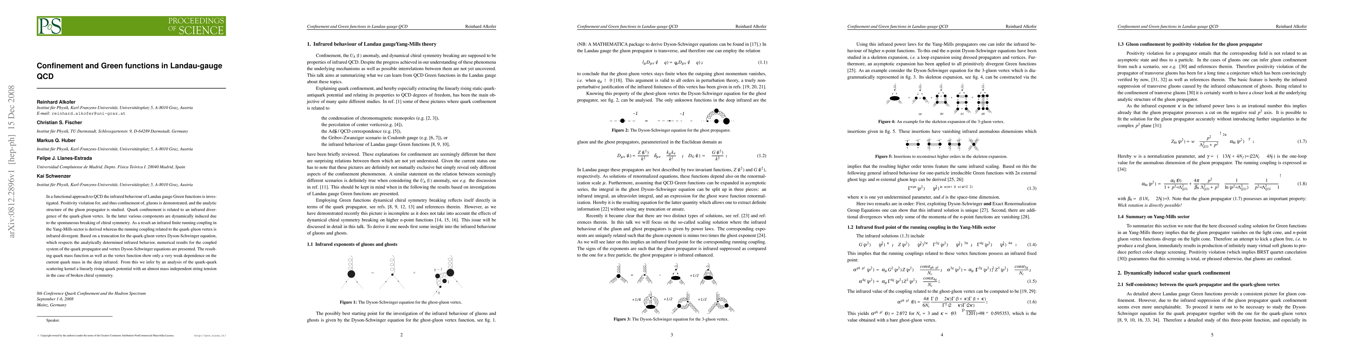 This paper investigates the infrared behavior of Landau gauge Green functions in QCD, demonstrating gluon confinement through positivity violation and analyzing the quark-gluon vertex's infrared divergence. It finds a linearly rising quark potential with a nearly mass-independent string tension, indicating spontaneous chiral symmetry breaking.