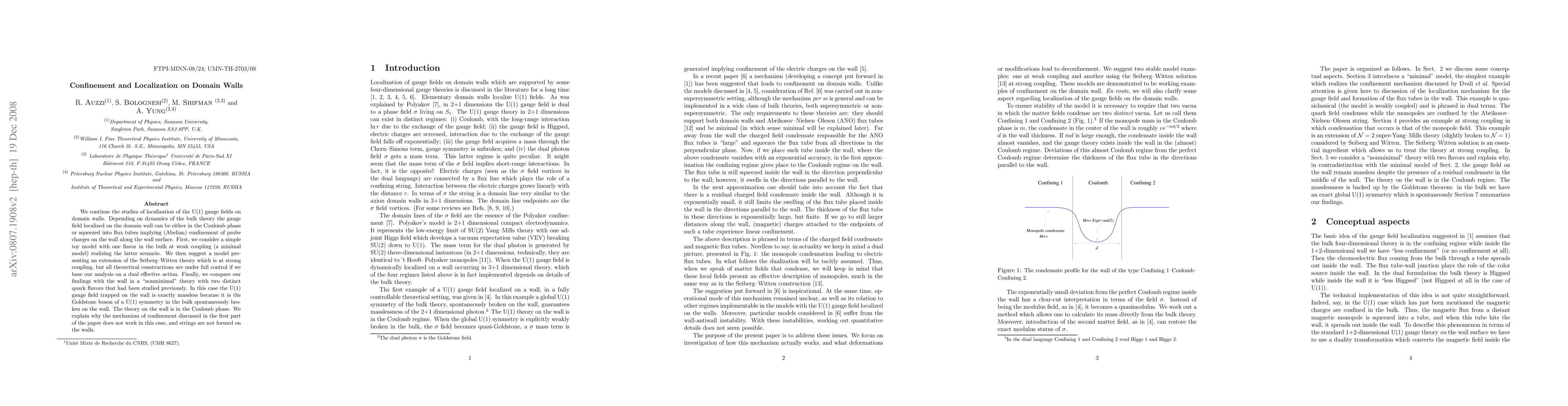 This paper investigates the localization of U(1) gauge fields on domain walls, exploring scenarios where confinement occurs either through Coulomb phase dynamics or flux tube formation. It contrasts a minimal model at weak coupling with a Seiberg-Witten theory extension at strong coupling, and explains why the confinement mechanism fails in a nonminimal theory with two quark flavors.