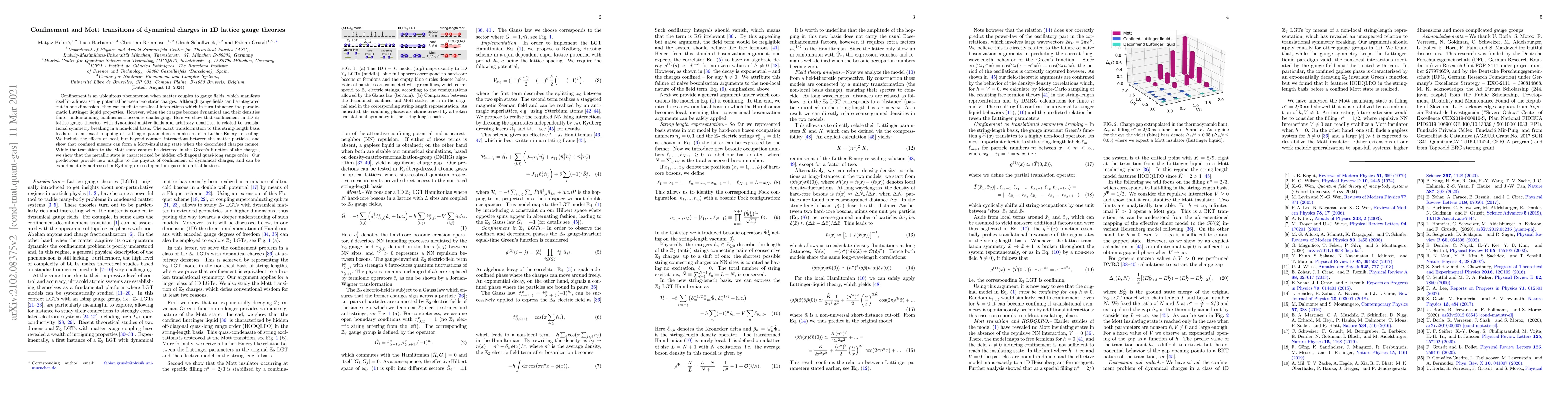 Confinement is an ubiquitous phenomenon when matter couples to gauge fields, which manifests itself in a linear string potential between two static charges. Although gauge fields can be integrated out in one dimension, they can mediate non-local interactions which in turn influence the paradigmatic Luttinger liquid properties. However, when the charges become dynamical and their densities finite, understanding confinement becomes challenging. Here we show that confinement in 1D $\mathbb{Z}_2$ lattice gauge theories, with dynamical matter fields and arbitrary densities, is related to translational symmetry breaking in a non-local basis. The exact transformation to this string-length basis leads us to an exact mapping of Luttinger parameters reminiscent of a Luther-Emery re-scaling. We include the effects of local, but beyond contact, interactions between the matter particles, and show that confined mesons can form a Mott-insulating state when the deconfined charges cannot. While the transition to the Mott state cannot be detected in the Green's function of the charges, we show that the metallic state is characterized by hidden off-diagonal quasi-long range order. Our predictions provide new insights to the physics of confinement of dynamical charges, and can be experimentally addressed in Rydberg-dressed quantum gases in optical lattices.