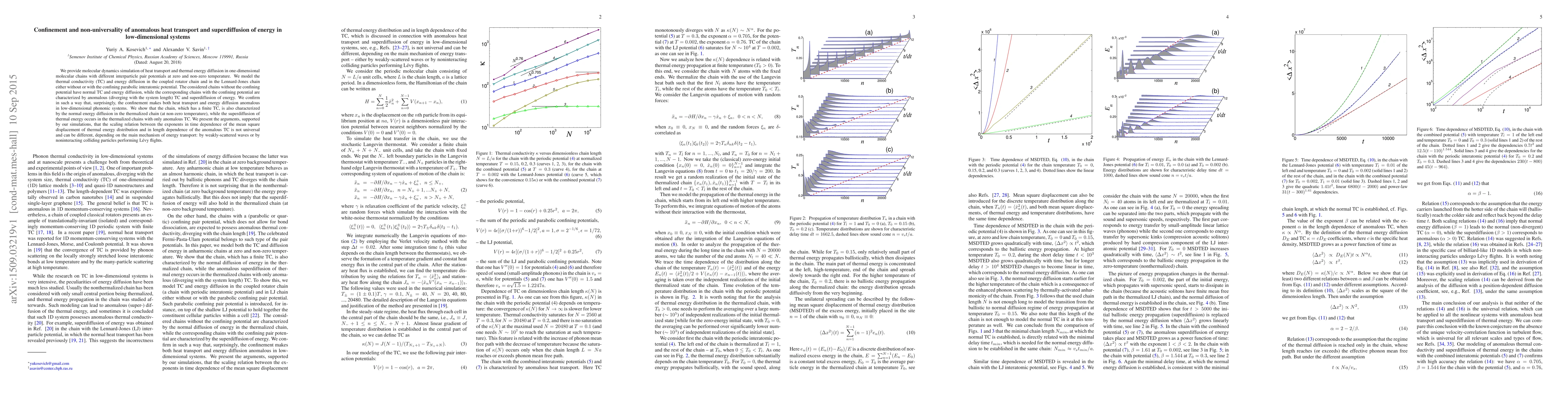 This paper uses molecular dynamics simulations to study heat transport and energy diffusion in one-dimensional molecular chains under different conditions. It finds that confinement leads to anomalous thermal conductivity and superdiffusion of energy, challenging the universality of scaling relations in low-dimensional phononic systems.