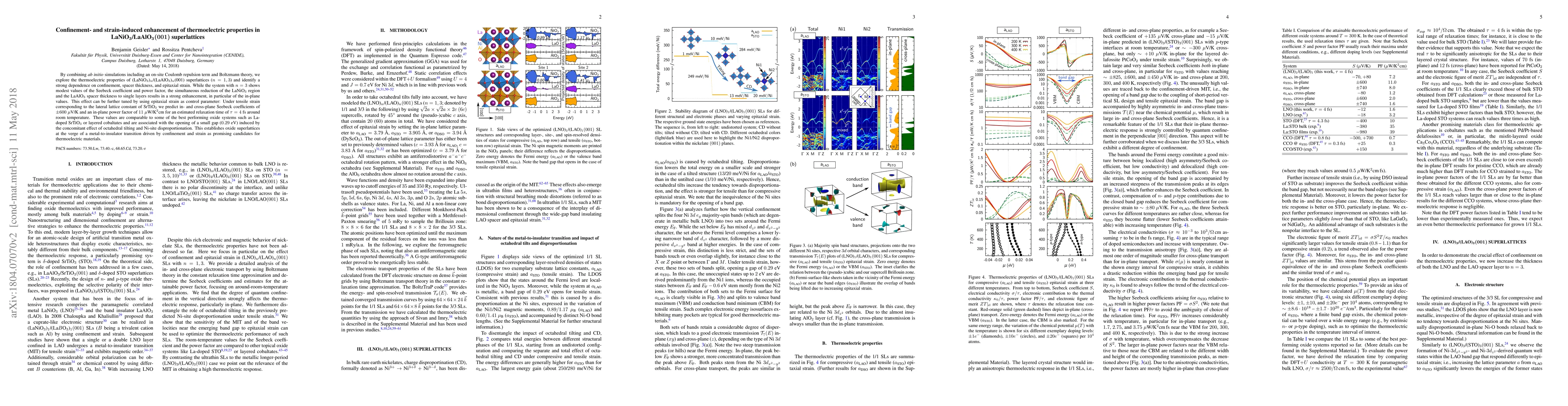 This study uses simulations and theoretical models to investigate how thermoelectric properties in LaNiO$_3$/LaAlO$_3$ superlattices are enhanced by confinement, reduced layer thickness, and epitaxial strain. It finds significant improvements in thermoelectric performance, especially in-plane, under tensile strain, predicting promising performance comparable to top oxide thermoelectric materials.