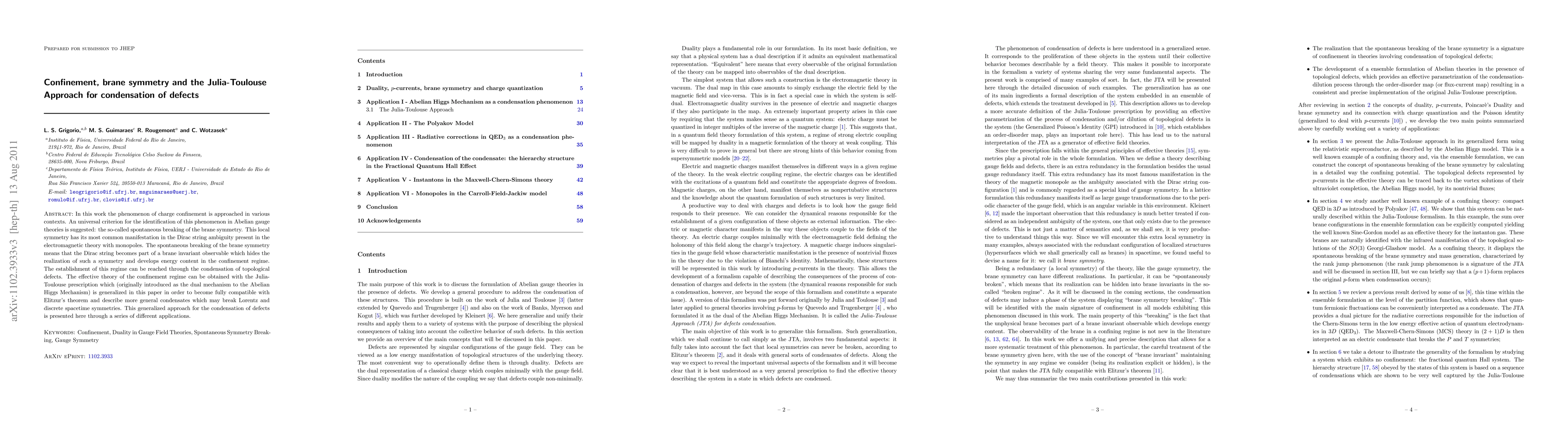 In this work the phenomenon of charge confinement is approached in various contexts. An universal criterion for the identification of this phenomenon in Abelian gauge theories is suggested: the so-called spontaneous breaking of the brane symmetry. This local symmetry has its most common manifestation in the Dirac string ambiguity present in the electromagnetic theory with monopoles. The spontaneous breaking of the brane symmetry means that the Dirac string becomes part of a brane invariant observable which hides the realization of such a symmetry and develops energy content in the confinement regime. The establishment of this regime can be reached through the condensation of topological defects. The effective theory of the confinement regime can be obtained with the Julia-Toulouse prescription which (originally introduced as the dual mechanism to the Abelian Higgs Mechanism) is generalized in this paper in order to become fully compatible with Elitzur's theorem and describe more general condensates which may break Lorentz and discrete spacetime symmetries. This generalized approach for the condensation of defects is presented here through a series of different applications.