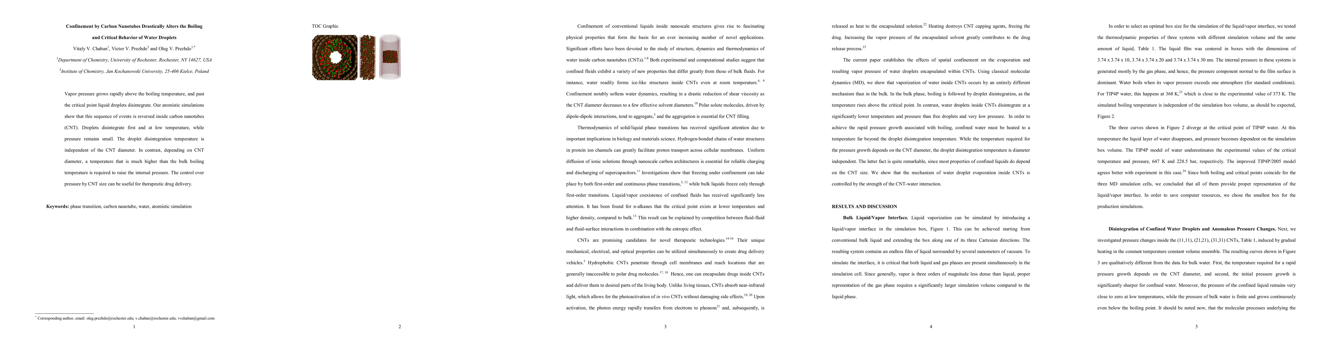 This study reveals that confinement within carbon nanotubes reverses the typical boiling and critical behavior of water droplets, causing disintegration at low temperatures before vapor pressure rises. The internal pressure remains low until a significantly higher temperature is reached, depending on the nanotube diameter, which could be beneficial for targeted drug delivery applications.