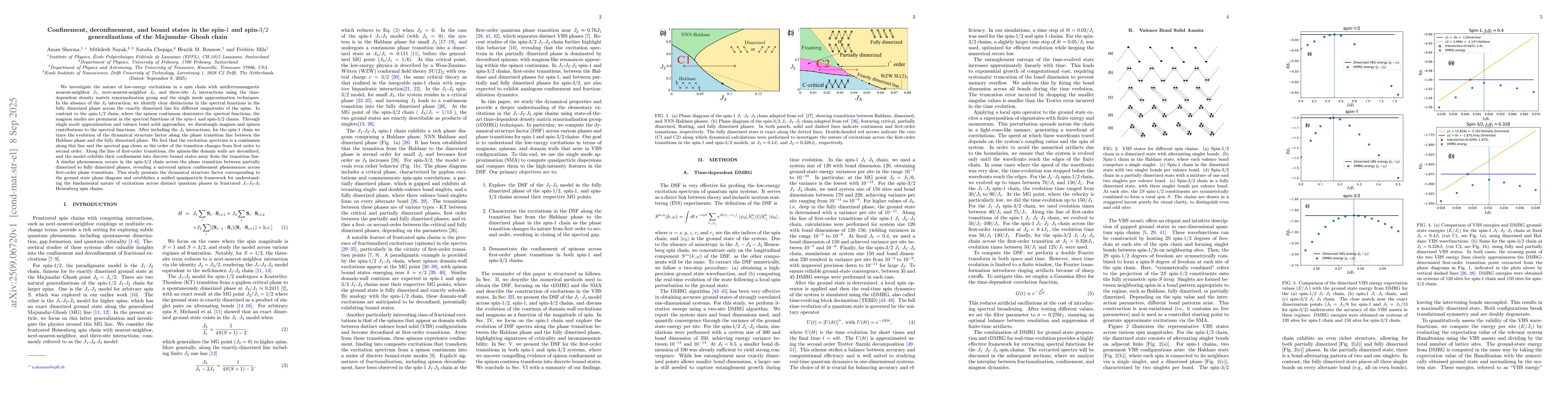 We investigate the nature of low-energy excitations in a spin chain with antiferrmomagnetic nearest-neighbor $J_1$, next-nearest-neighbor $J_2$, and three-site $J_3$ interactions using the time-dependent density matrix renormalization group and the single mode approximation techniques. In the absence of the $J_2$ interaction, we identify clear distinctions in the spectral functions in the fully dimerized phase across the exactly dimerized line for different magnitudes of the spins. In contrast to the spin-$1/2$ chain, where the spinon continuum dominates the spectral functions, the magnon modes are prominent in the spectral functions of the spin-$1$ and spin-$3/2$ chains. Through single mode approximation and valence bond solid approaches, we disentangle magnon and spinon contributions to the spectral functions. After including the $J_2$ interactions, for the spin-$1$ chain we trace the evolution of the dynamical structure factor along the phase transition line between the Haldane phase and the fully dimerized phase. We find that the excitation spectrum is a continuum along this line and the spectral gap closes as the order of the transition changes from first order to second order. Along the line of first-order transitions, the spinon-like domain walls are deconfined, and the model exhibits their confinement into discrete bound states away from the transition line. A similar phenomenon occurs in the spin-$3/2$ chain across the phase transition between partially dimerized to fully dimerized phases, revealing a universal spinon confinement phenomenon across first-order phase transitions. This study presents the dynamical structure factor corresponding to the ground state phase diagram and establishes a unified quasiparticle framework for understanding the fundamental nature of excitations across distinct quantum phases in frustrated $J_1$-$J_2$-$J_3$ Heisenberg spin chains.