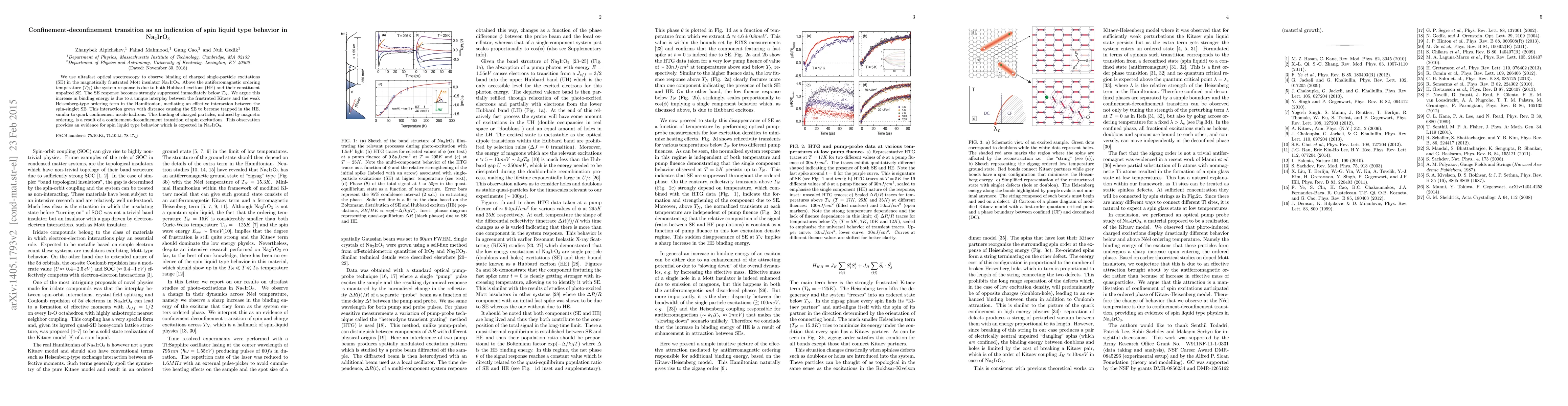 We use ultrafast optical spectroscopy to observe binding of charged single-particle excitations (SE) in the magnetically frustrated Mott insulator Na$_2$IrO$_3$. Above the antiferromagnetic ordering temperature ($T_N$) the system response is due to both Hubbard excitons (HE) and their constituent unpaired SE. The SE response becomes strongly suppressed immediately below $T_N$. We argue that this increase in binding energy is due to a unique interplay between the frustrated Kitaev and the weak Heisenberg-type ordering term in the Hamiltonian, mediating an effective interaction between the spin-singlet SE. This interaction grows with distance causing the SE to become trapped in the HE, similar to quark confinement inside hadrons. This binding of charged particles, induced by magnetic ordering, is a result of a confinement-deconfinement transition of spin excitations. This observation provides evidence for spin liquid type behavior which is expected in Na$_2$IrO$_3$.