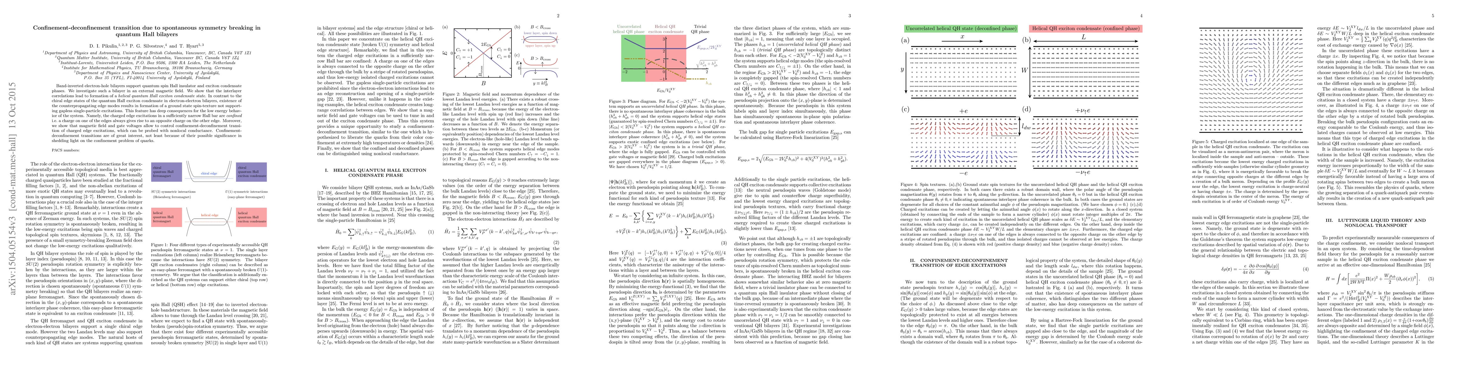 This paper investigates the confinement-deconfinement transition in quantum Hall bilayers due to spontaneous symmetry breaking, showing that interlayer correlations lead to a helical quantum Hall exciton condensate state. The study reveals that magnetic field and gate voltages can control this transition, which has implications for understanding the confinement problem of quarks.
