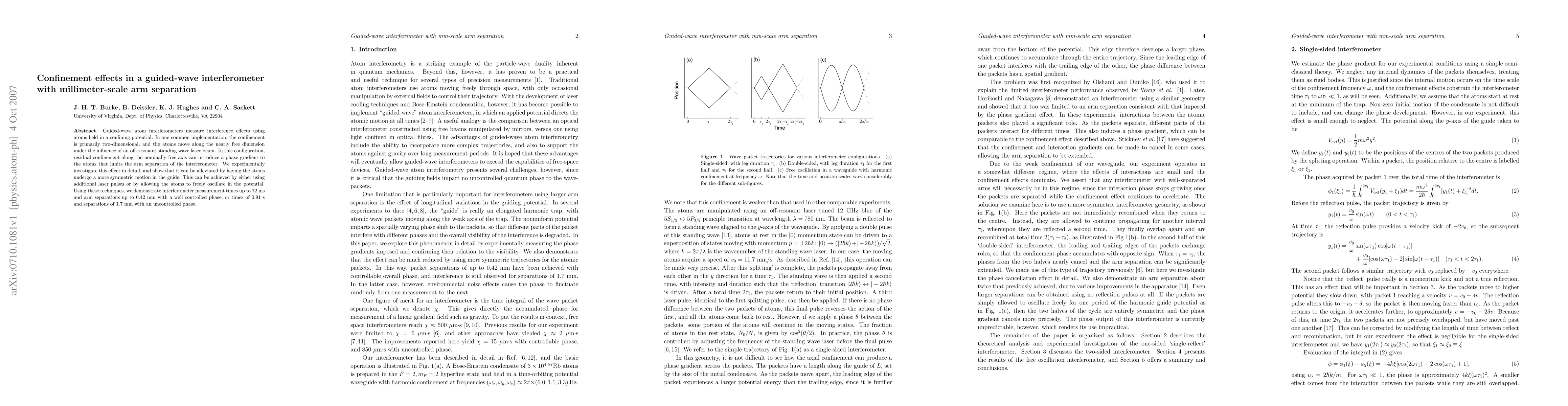 Guided-wave atom interferometers measure interference effects using atoms held in a confining potential. In one common implementation, the confinement is primarily two-dimensional, and the atoms move along the nearly free dimension under the influence of an off-resonant standing wave laser beam. In this configuration, residual confinement along the nominally free axis can introduce a phase gradient to the atoms that limits the arm separation of the interferometer. We experimentally investigate this effect in detail, and show that it can be alleviated by having the atoms undergo a more symmetric motion in the guide. This can be achieved by either using additional laser pulses or by allowing the atoms to freely oscillate in the potential. Using these techniques, we demonstrate interferometer measurement times up to 72 ms and arm separations up to 0.42 mm with a well controlled phase, or times of 0.91 s and separations of 1.7 mm with an uncontrolled phase.