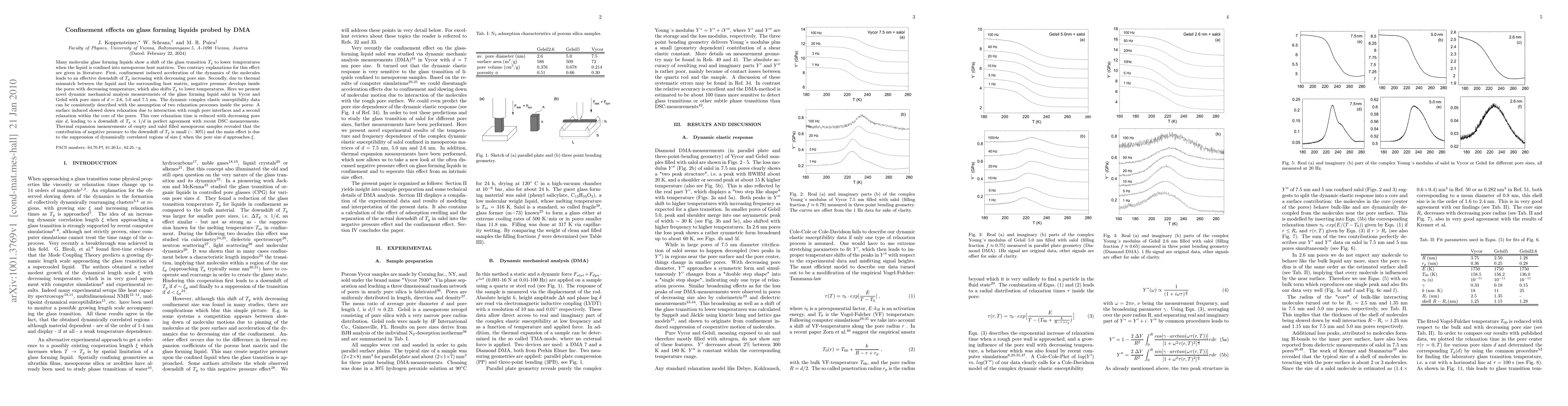 Many molecular glass forming liquids show a shift of the glass transition T-g to lower temperatures when the liquid is confined into mesoporous host matrices. Two contrary explanations for this effect are given in literature: First, confinement induced acceleration of the dynamics of the molecules leads to an effective downshift of T-g increasing with decreasing pore size. Second, due to thermal mismatch between the liquid and the surrounding host matrix, negative pressure develops inside the pores with decreasing temperature, which also shifts T-g to lower temperatures. Here we present dynamic mechanical analysis measurements of the glass forming liquid salol in Vycor and Gelsil with pore sizes of d=2.6, 5.0 and 7.5 nm. The dynamic complex elastic susceptibility data can be consistently described with the assumption of two relaxation processes inside the pores: A surface induced slowed down relaxation due to interaction with rough pore interfaces and a second relaxation within the core of the pores. This core relaxation time is reduced with decreasing pore size d, leading to a downshift of T-g proportional to 1/d in perfect agreement with recent differential scanning calorimetry (DSC) measurements. Thermal expansion measurements of empty and salol filled mesoporous samples revealed that the contribution of negative pressure to the downshift of T-g is small (<30%) and the main effect is due to the suppression of dynamically correlated regions of size xi when the pore size xi approaches.