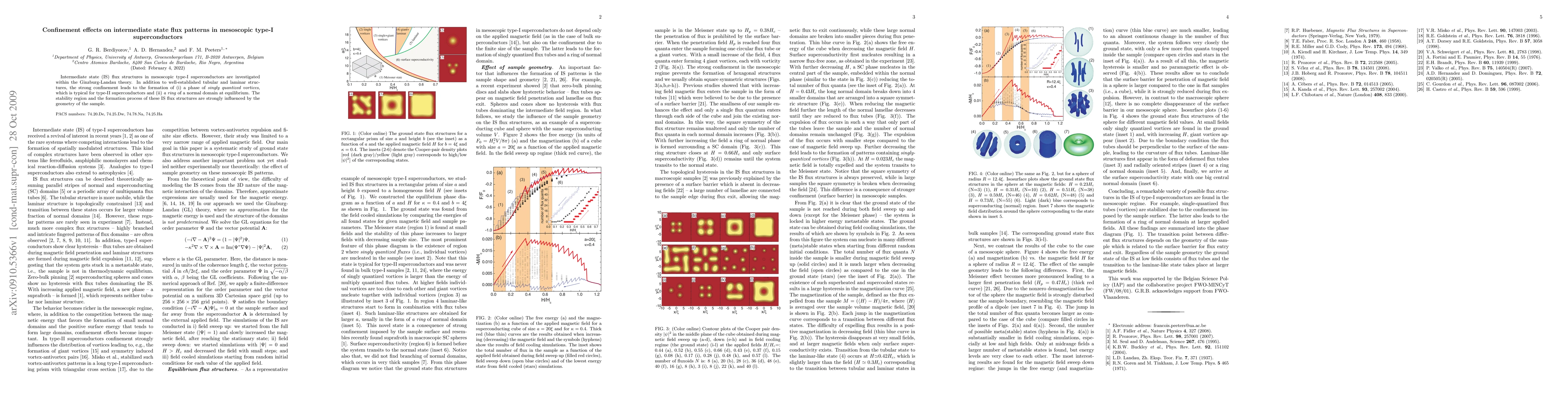 This study explores intermediate state flux patterns in mesoscopic type-I superconductors using Ginzburg-Landau theory, revealing the emergence of singly quantized vortices and normal domain rings under strong confinement, with their stability and formation significantly affected by the sample's geometry.