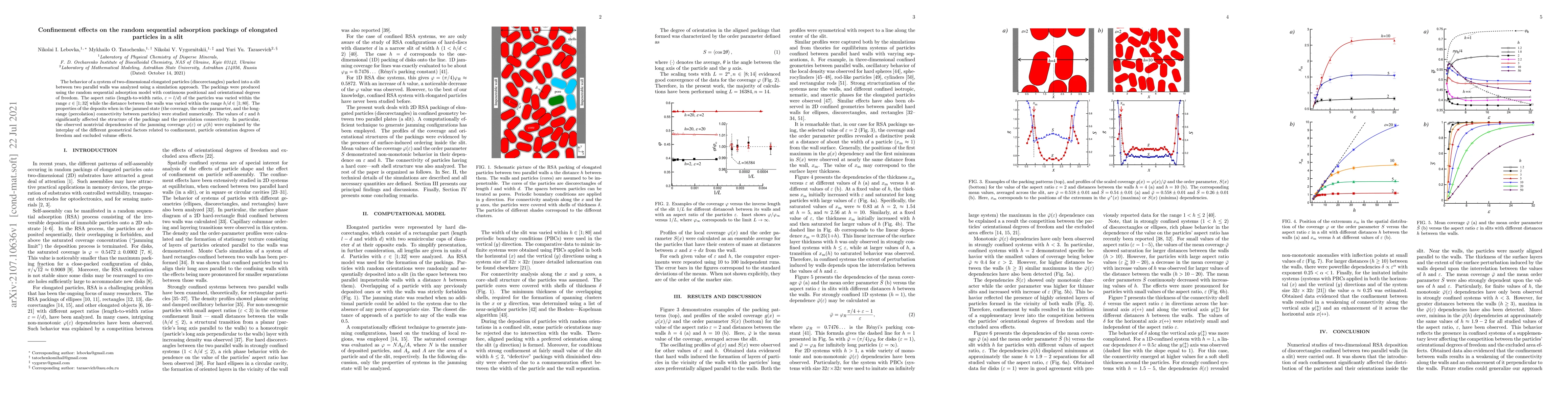 The behavior of a system of two-dimensional elongated particles (discorectangles) packed into a slit between two parallel walls was analyzed using a simulation approach. The packings were produced using the random sequential adsorption model with continuous positional and orientational degrees of freedom. The aspect ratio (length-to-width ratio, $\varepsilon=l/d$) of the particles was varied within the range $\varepsilon \in [1;32]$ while the distance between the walls was varied within the range $h/d\in [1;80]$. The properties of the deposits when in the jammed state (the coverage, the order parameter, and the long-range (percolation) connectivity between particles) were studied numerically. The values of $\varepsilon$ and $h$ significantly affected the structure of the packings and the percolation connectivity. In particular, the observed nontrivial dependencies of the jamming coverage $\varphi(\varepsilon)$ or $\varphi(h)$ were explained by the interplay of the different geometrical factors related to confinement, particle orientation degrees of freedom and excluded volume effects.