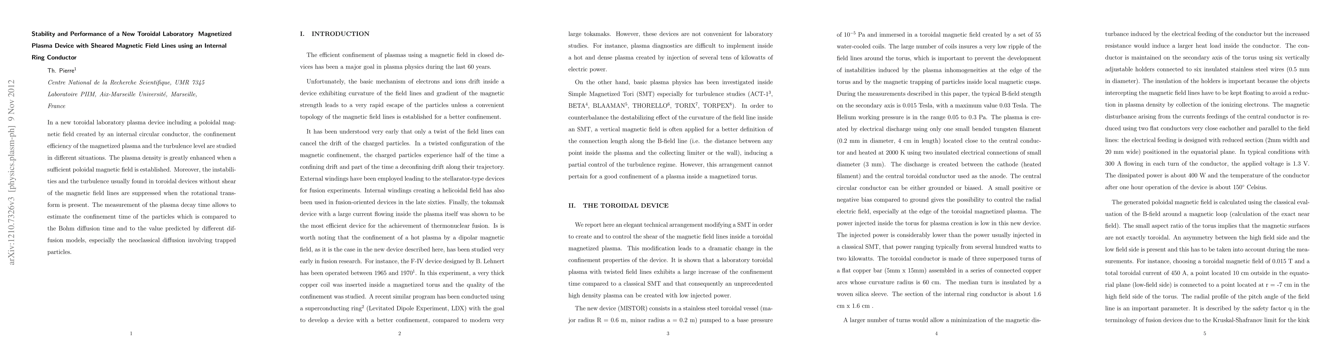 A new toroidal plasma device with a sheared magnetic field line is found to enhance plasma density and suppress instabilities, achieving better confinement efficiency compared to traditional devices.