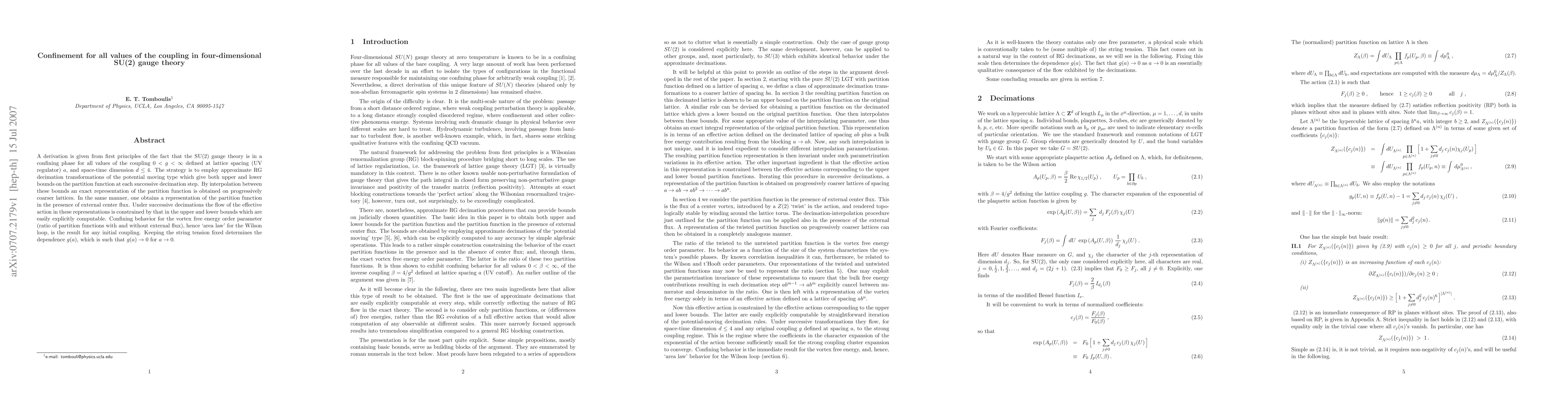 A derivation is given from first principles of the fact that the SU(2) gauge theory is in a confining phase for all values of the coupling $0 < g < \infty$ defined at lattice spacing (UV regulator) $a$, and space-time dimension $d \leq 4$. The strategy is to employ approximate RG decimation transformations of the potential moving type which give both upper and lower bounds on the partition function at each successive decimation step. By interpolation between these bounds an exact representation of the partition function is obtained on progressively coarser lattices. In the same manner, one obtains a representation of the partition function in the presence of external center flux. Under successive decimations the flow of the effective action in these representations is constrained by that in the upper and lower bounds which are easily explicitly computable. Confining behavior for the vortex free energy order parameter (ratio of partition functions with and without external flux), hence `area law' for the Wilson loop, is the result for any initial coupling. Keeping the string tension fixed determines the dependence $g(a)$, which is such that $g(a) \to 0$ for $a \to 0$.
