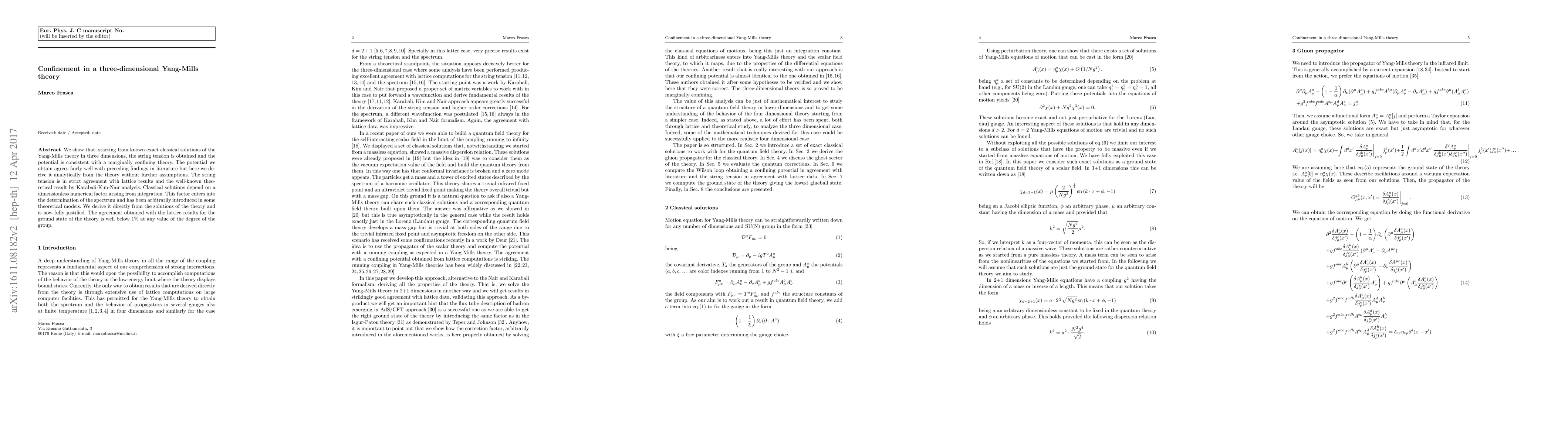 We show that, starting from known exact classical solutions of the Yang-Mills theory in three dimensions, the string tension is obtained and the potential is consistent with a marginally confining theory. The potential we obtain agrees fairly well with preceding findings in literature but here we derive it analytically from the theory without further assumptions. The string tension is in strict agreement with lattice results and the well-known theoretical result by Karabali-Kim-Nair analysis. Classical solutions depend on a dimensionless numerical factor arising from integration. This factor enters into the determination of the spectrum and has been arbitrarily introduced in some theoretical models. We derive it directly from the solutions of the theory and is now fully justified. The agreement obtained with the lattice results for the ground state of the theory is well below 1% at any value of the degree of the group.