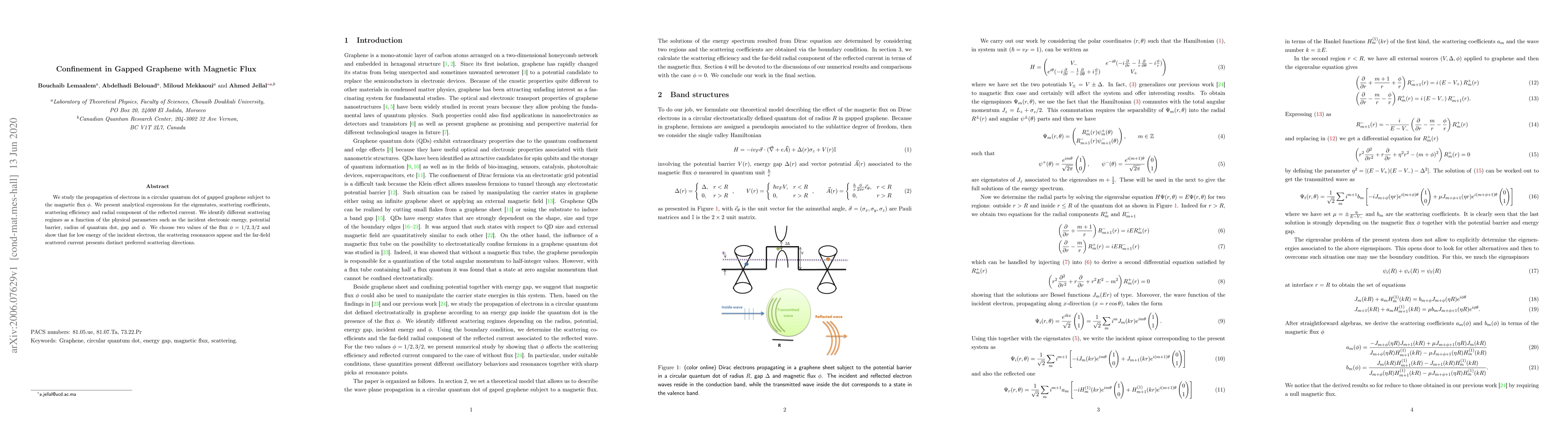 This paper investigates electron propagation in gapped graphene within a circular quantum dot under magnetic flux, deriving analytical expressions for eigenstates and scattering properties. It identifies distinct scattering regimes based on energy, barrier, and flux, revealing scattering resonances and preferred scattering directions at low energies.