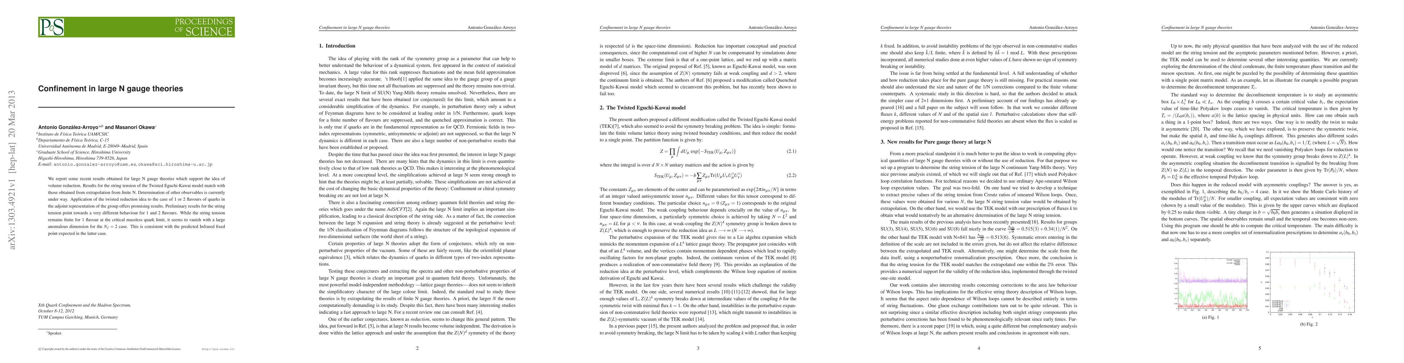 This paper reports on large N gauge theories, confirming the volume reduction hypothesis through matching string tension results from the Twisted Eguchi-Kawai model. Preliminary findings suggest distinct string tension behaviors for 1 and 2 quark flavors, with the tension vanishing for $N_f=2$ consistent with predicted Infrared fixed points.