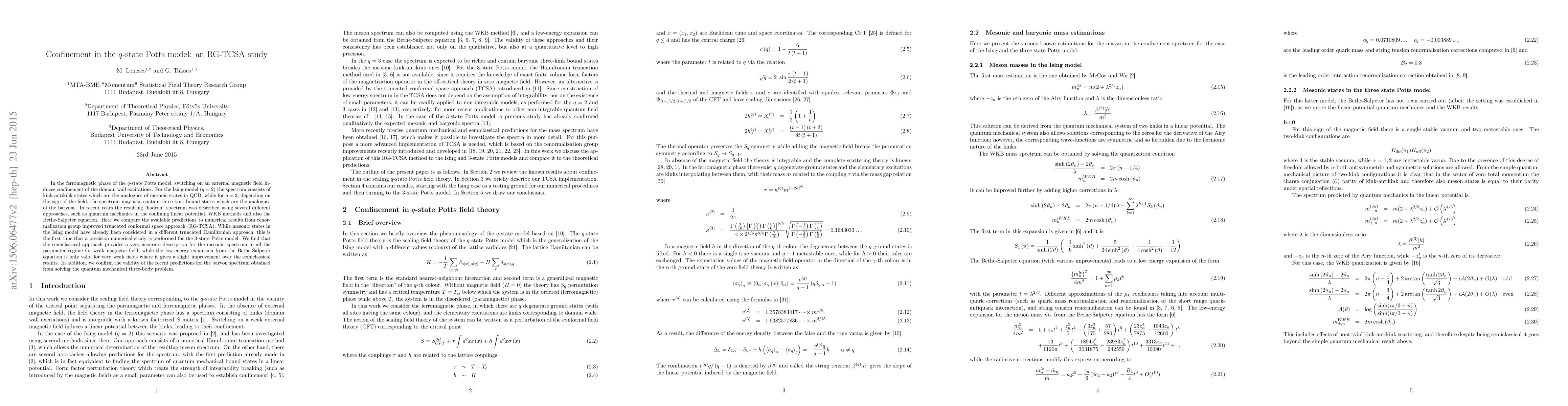 In the ferromagnetic phase of the q-state Potts model, switching on an external magnetic field induces confinement of the domain wall excitations. For the Ising model (q = 2) the spectrum consists of kink-antikink states which are the analogues of mesonic states in QCD, while for q = 3, depending on the sign of the field, the spectrum may also contain three-kink bound states which are the analogues of the baryons. In recent years the resulting "hadron" spectrum was described using several different approaches, such as quantum mechanics in the confining linear potential, WKB methods and also the Bethe-Salpeter equation. Here we compare the available predictions to numerical results from renormalization group improved truncated conformal space approach (RG-TCSA). While mesonic states in the Ising model have already been considered in a different truncated Hamiltonian approach, this is the first time that a precision numerical study is performed for the 3-state Potts model. We find that the semiclassical approach provides a very accurate description for the mesonic spectrum in all the parameter regime for weak magnetic field, while the low-energy expansion from the Bethe-Salpeter equation is only valid for very weak fields where it gives a slight improvement over the semiclassical results. In addition, we confirm the validity of the recent predictions for the baryon spectrum obtained from solving the quantum mechanical three-body problem.