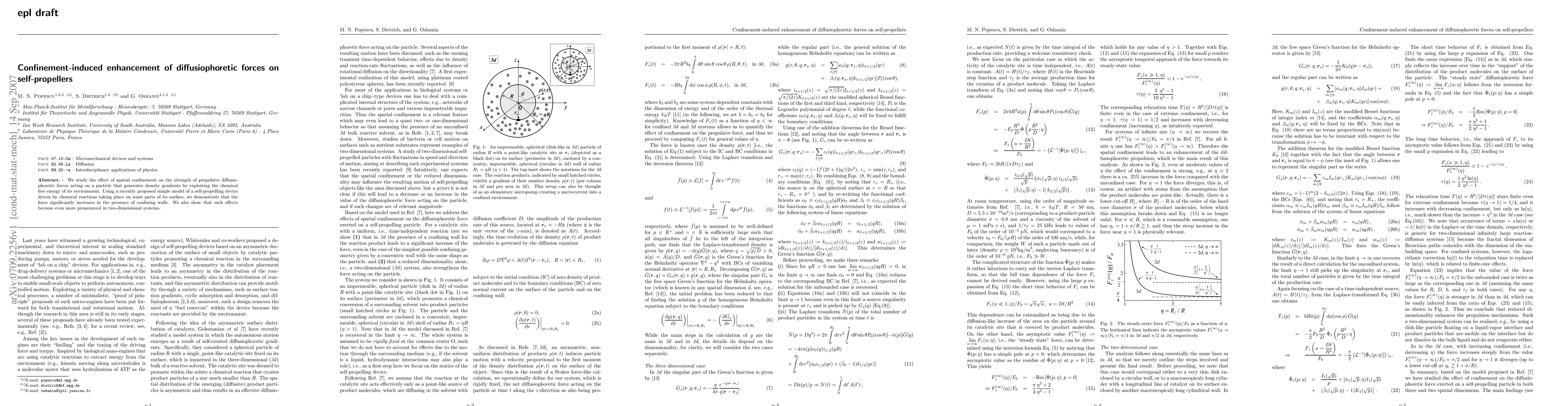We study the effect of spatial confinement on the strength of propulsive diffusiophoretic forces acting on a particle that generates density gradients by exploiting the chemical free energy of its environment. Using a recently proposed simple model of a self-propelling device driven by chemical reactions taking place on some parts of its surface, we demonstrate that the force significantly increases in the presence of confining walls. We also show that such effects become even more pronounced in two-dimensional systems.