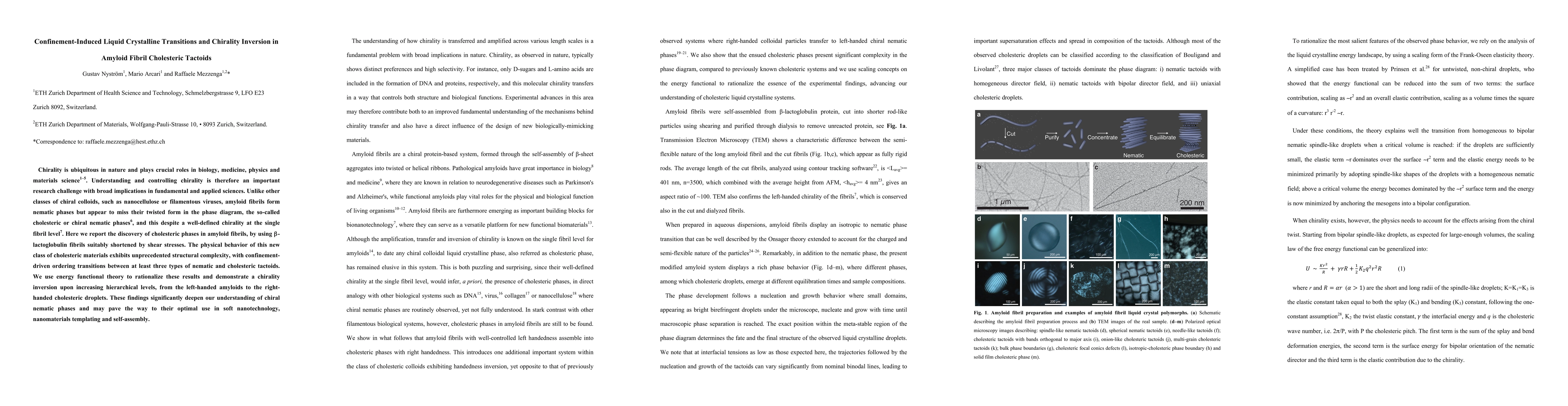 This paper reports the discovery of cholesteric phases in amyloid fibrils, achieved by shortening fibrils via shear stress, revealing complex structural transitions and chirality inversion. The findings enhance understanding of chiral nematic phases and their potential applications in nanotechnology and materials science.