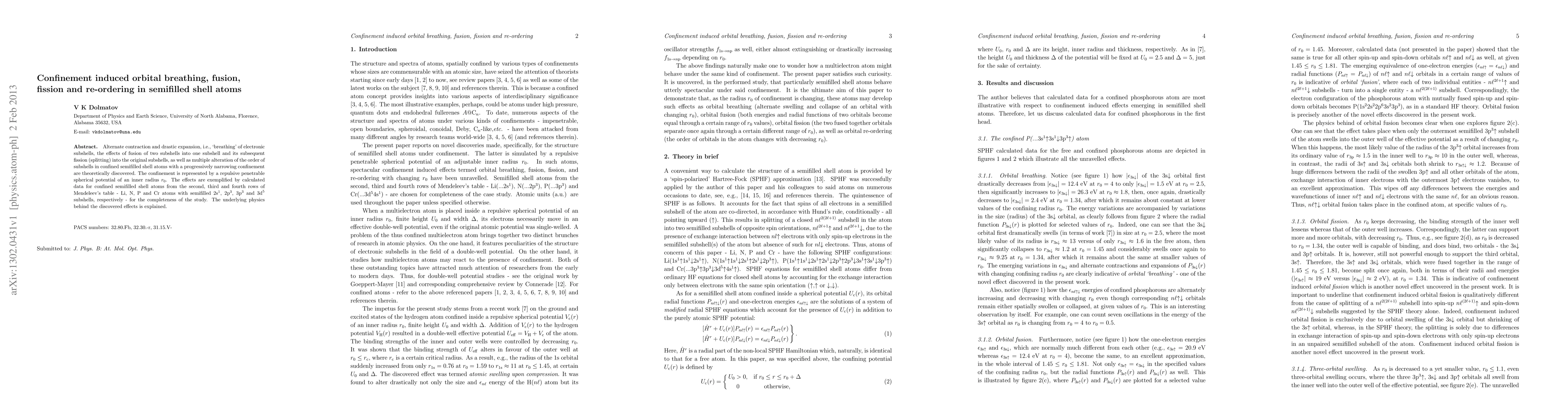 Alternate contraction and drastic expansion, i.e., `breathing' of electronic subshells, the effects of fusion of two subshells into one subshell and its subsequent fission (splitting) into the original subshells, as well as multiple alteration of the order of subshells in confined semifilled shell atoms with a progressively narrowing confinement are theoretically discovered. The confinement is represented by a repulsive penetrable spherical potential of an inner radius $r_{0}$. The effects are exemplified by calculated data for confined semifilled shell atoms from the second, third and fourth rows of Mendeleev's table - Li, N, P and Cr atoms with semifilled ${2\rm s}^{1}$, ${2\rm p}^{3}$, ${3\rm p}^{3}$ and ${3\rm d}^{5}$ subshells, respectively - for the completeness of the study. The underlying physics behind the discovered effects is explained.