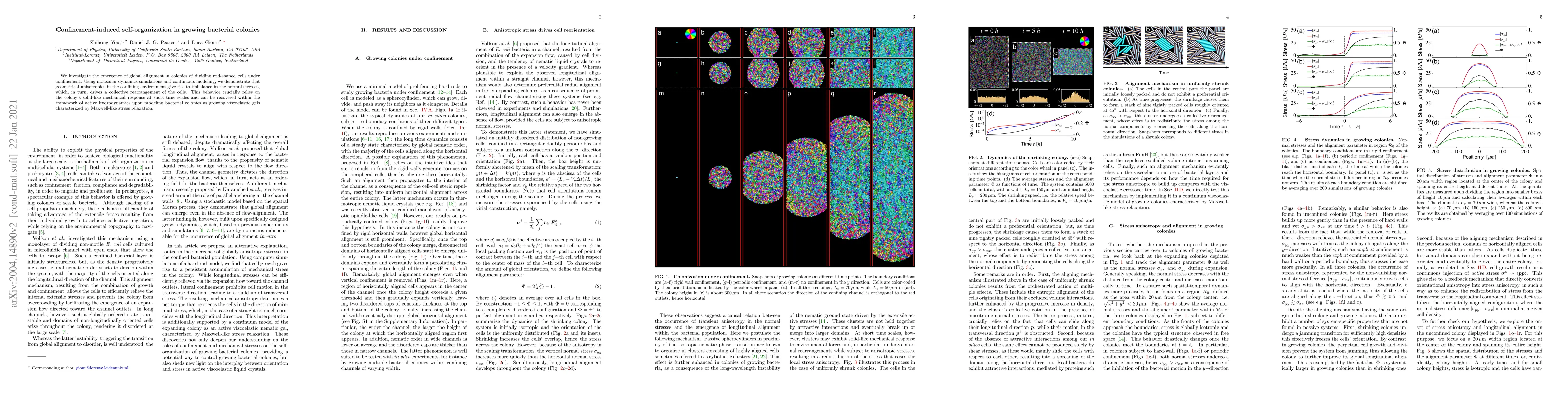 This study explores how geometrical constraints lead to global alignment in growing bacterial colonies of rod-shaped cells, revealing that confinement induces a collective rearrangement driven by stress imbalances, modeled as viscoelastic gels with Maxwell-like stress relaxation.
