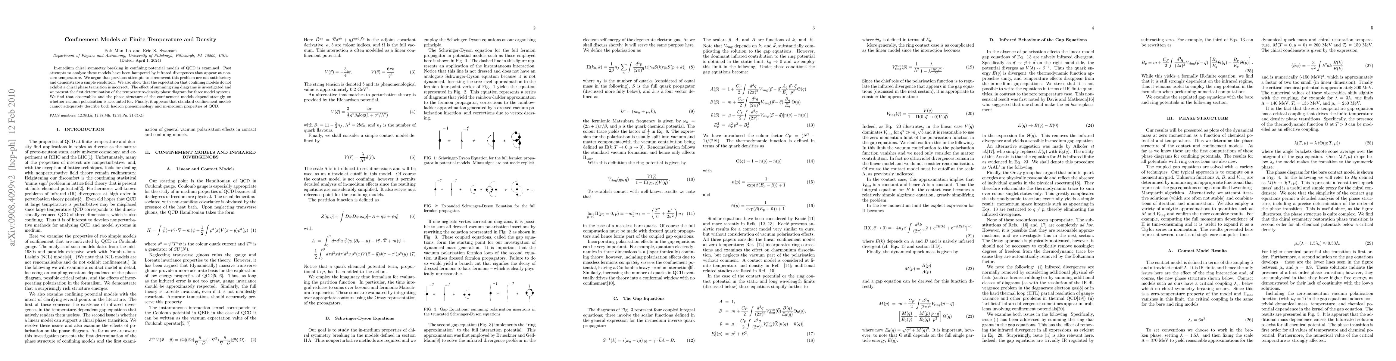 In-medium chiral symmetry breaking in confining potential models of QCD is examined. Past attempts to analyse these models have been hampered by infrared divergences that appear at non-zero temperature. We argue that previous attempts to circumvent this problem are not satisfactory and demonstrate a simple resolution. We also show that the expectation that confining models do not exhibit a chiral phase transition is incorrect. The effect of summing ring diagrams is investigated and we present the first determination of the temperature-density phase diagram for two model systems. We find that observables and the phase structure of the confinement models depend strongly on whether quark polarisation is accounted for. Finally, it appears that standard confinement models cannot adequately describe both hadron phenomenology and in-medium properties of QCD.
