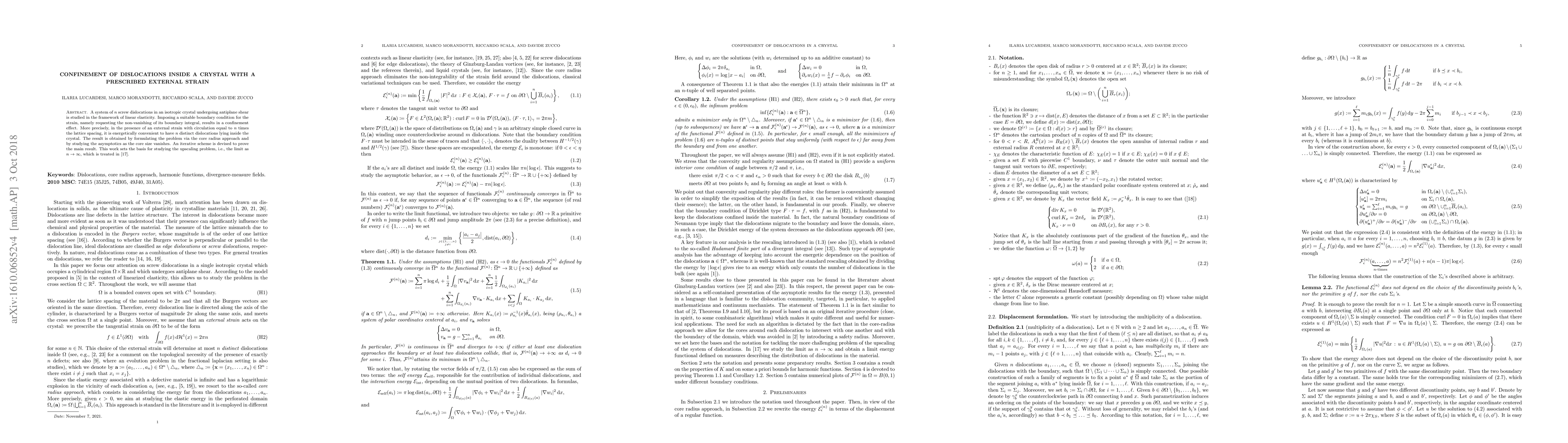 A system of $n$ screw dislocations in an isotropic crystal undergoing antiplane shear is studied in the framework of linear elasticity. Imposing a suitable boundary condition for the strain, namely requesting the non-vanishing of its boundary integral, results in a confinement effect. More precisely, in the presence of an external strain with circulation equal to n times the lattice spacing, it is energetically convenient to have n distinct dislocations lying inside the crystal. The result is obtained by formulating the problem via the core radius approach and by studying the asymptotics as the core size vanishes. An iterative scheme is devised to prove the main result. This work sets the basis for studying the upscaling problem, i.e., the limit as $n\to\infty$, which is treated in [17].