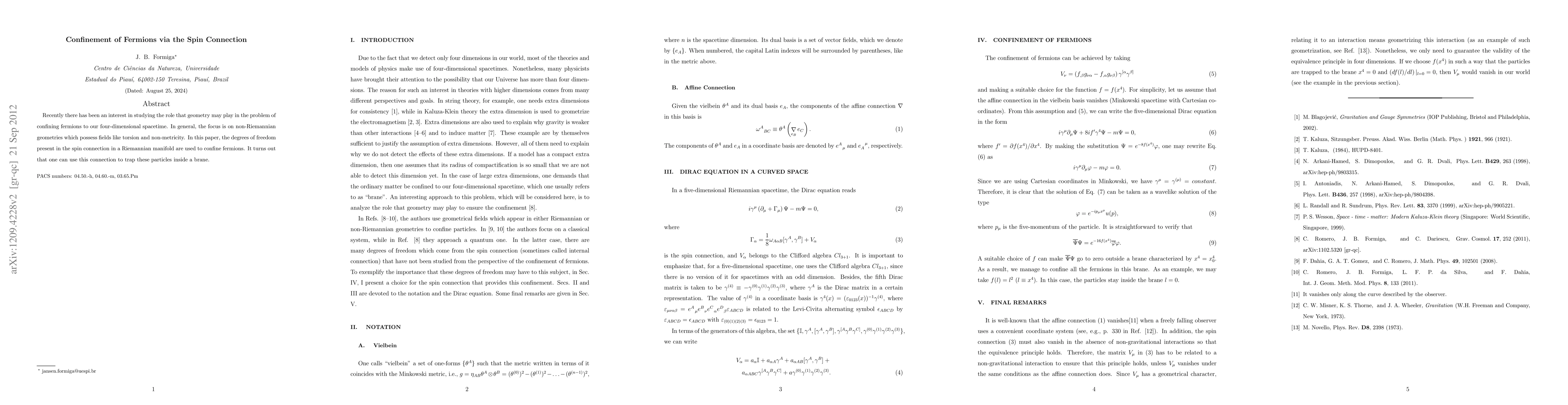Recently there has been an interest in studying the role that geometry may play in the problem of confining fermions to our four-dimensional spacetime. In general, the focus is on non-Riemannian geometries which possess fields like torsion and non-metricity. In this paper, the degrees of freedom present in the spin connection in a Riemannian manifold are used to confine fermions. It turns out that one can use this connection to trap these particles inside a brane.