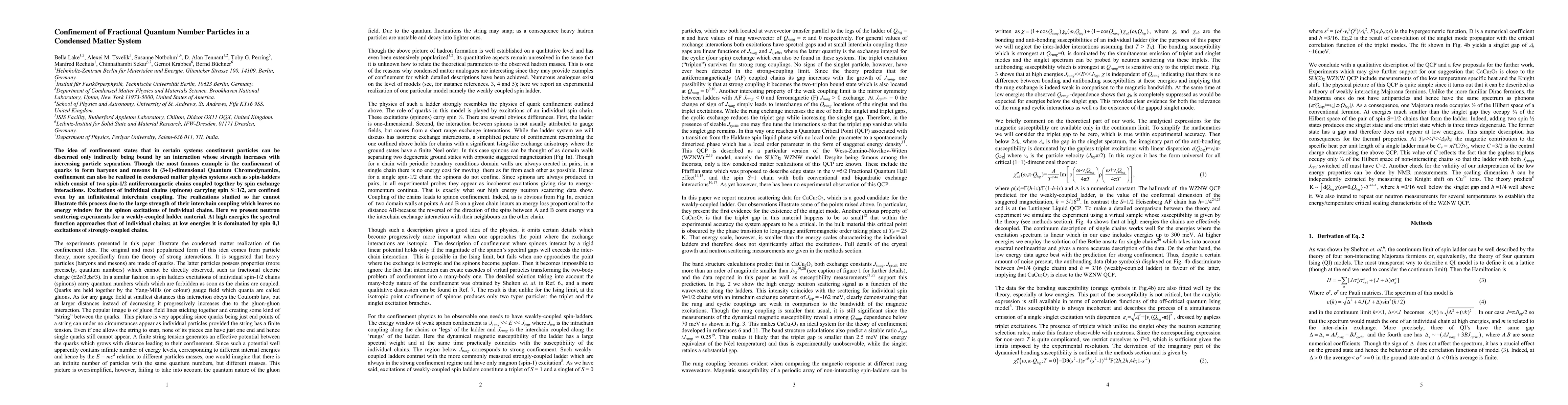 The idea of confinement states that in certain systems constituent particles can be discerned only indirectly being bound by an interaction whose strength increases with increasing particle separation. Though the most famous example is the confinement of quarks to form baryons and mesons in (3+1)-dimensional Quantum Chromodynamics, confinement can also be realized in the systems of condensed matter physics such as spin-ladders which consist of two spin-1/2 antiferromagnetic chains coupled together by spin exchange interactions. Excitations of individual chains (spinons) carrying spin S=1/2, are confined even by an infinitesimal interchain coupling. The realizations studied so far cannot illustrate this process due to the large strength of their interchain coupling which leaves no energy window for the spinon excitations of individual chains. Here we present neutron scattering experiments for a weakly-coupled ladder material. At high energies the spectral function approaches that of individual chains; at low energies it is dominated by spin 0,1 excitations of strongly-coupled chains.