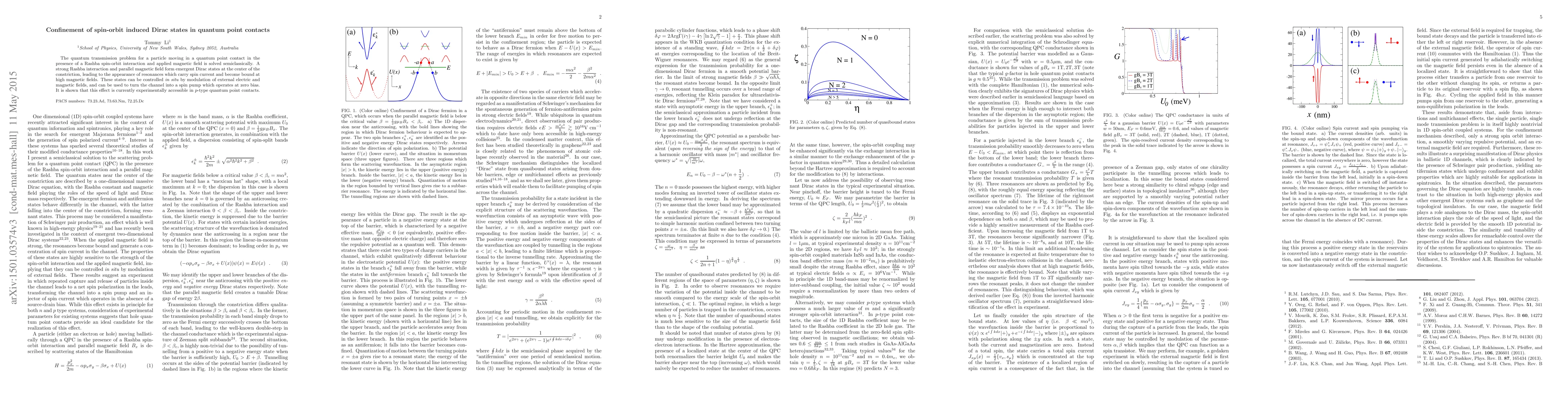The quantum transmission problem for a particle moving in a quantum point contact in the presence of a Rashba spin-orbit interaction and applied magnetic field is solved semiclassically. A strong Rashba interaction and parallel magnetic field form emergent Dirac states at the center of the constriction, leading to the appearance of resonances which carry spin current and become bound at high magnetic fields. These states can be controlled in situ by modulation of external electric and magnetic fields, and can be used to turn the channel into a spin pump which operates at zero bias. It is shown that this effect is currently experimentally accessible in $p$-type quantum point contacts.