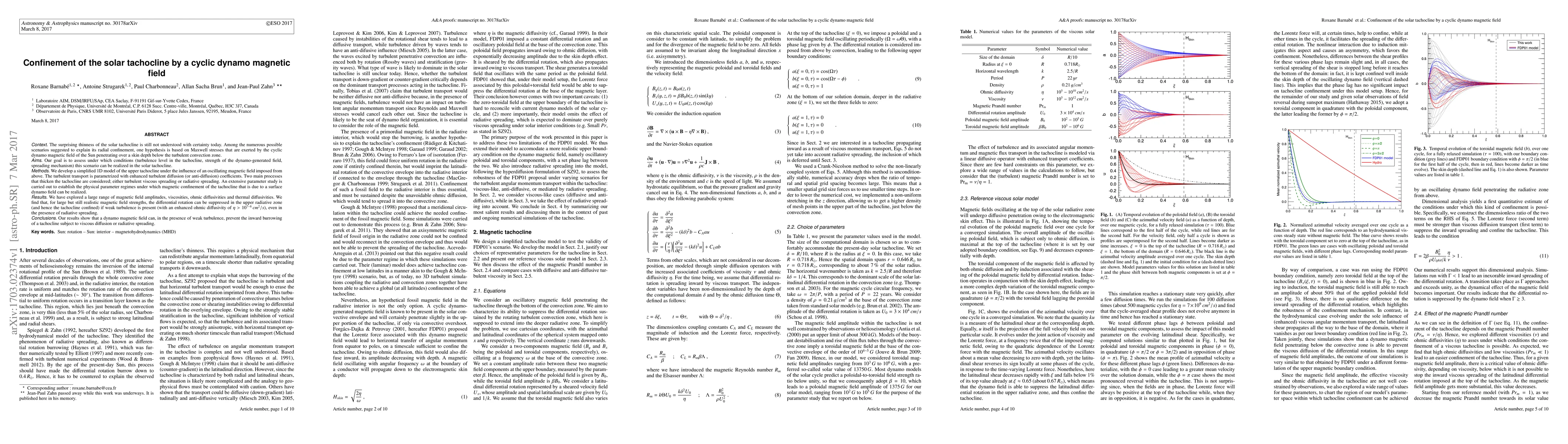 This paper investigates the confinement of the solar tachocline by a cyclic dynamo magnetic field, proposing that Maxwell stresses from the magnetic field can thin the tachocline. The study finds that large but realistic magnetic field strengths can suppress differential rotation in the upper radiative zone, confining the tachocline under conditions of weak turbulence and enhanced ohmic diffusivity.