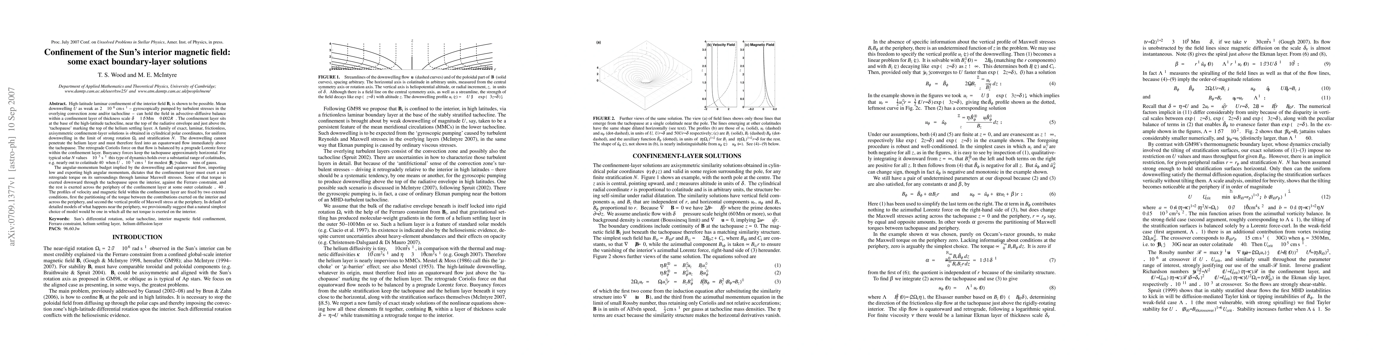 High-latitude laminar confinement of the Sun's interior magnetic field is shown to be possible, as originally proposed by Gough and McIntyre (1998) but contrary to a recent claim by Brun and Zahn (A&A 2006). Mean downwelling as weak as 2x10^-6cm/s -- gyroscopically pumped by turbulent stresses in the overlying convection zone and/or tachocline -- can hold the field in advective-diffusive balance within a confinement layer of thickness scale ~ 1.5Mm ~ 0.002 x (solar radius) while transmitting a retrograde torque to the Ferraro-constrained interior. The confinement layer sits at the base of the high-latitude tachocline, near the top of the radiative envelope and just above the `tachopause' marking the top of the helium settling layer. A family of exact, laminar, frictionless, axisymmetric confinement-layer solutions is obtained for uniform downwelling in the limit of strong rotation and stratification. A scale analysis shows that the flow is dynamically stable and the assumption of laminar flow realistic. The solution remains valid for downwelling values of the order of 10^-5cm/s but not much larger. This suggests that the confinement layer may be unable to accept a much larger mass throughput. Such a restriction would imply an upper limit on possible internal field strengths, perhaps of the order of hundreds of gauss, and would have implications also for ventilation and lithium burning. The solutions have interesting chirality properties not mentioned in the paper owing to space restrictions, but described at http://www.atmos-dynamics.damtp.cam.ac.uk/people/mem/papers/SQBO/solarfigure.html