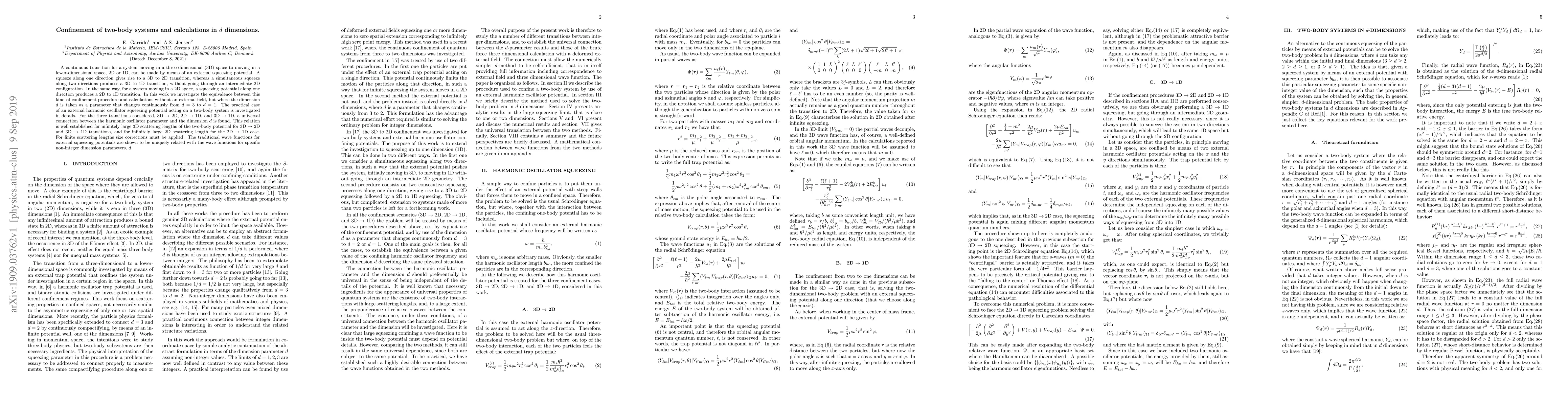 A continuous transition for a system moving in a three-dimensional (3D) space to moving in a lower-dimensional space, 2D or 1D, can be made by means of an external squeezing potential. A squeeze along one direction gives rise to a 3D to 2D transition, whereas a simultaneous squeeze along two directions produces a 3D to 1D transition, without going through an intermediate 2D configuration. In the same way, for a system moving in a 2D space, a squeezing potential along one direction produces a 2D to 1D transition. In this work we investigate the equivalence between this kind of confinement procedure and calculations without an external field, but where the dimension $d$ is taken as a parameter that changes continuously from $d=3$ to $d=1$. The practical case of an external harmonic oscillator squeezing potential acting on a two-body system is investigated in details. For the three transitions considered, 3D~$\rightarrow$~2D, 2D~$\rightarrow$~1D, and 3D~$\rightarrow$~1D, a universal connection between the harmonic oscillator parameter and the dimension $d$ is found. This relation is well established for infinitely large 3D scattering lengths of the two-body potential for 3D~$\rightarrow$~2D and 3D~$\rightarrow$~1D transitions, and for infinitely large 2D scattering length for the 2D~$\rightarrow$~1D case. For finite scattering lengths size corrections must be applied. The traditional wave functions for external squeezing potentials are shown to be uniquely related with the wave functions for specific non-integer dimension parameters, $d$.