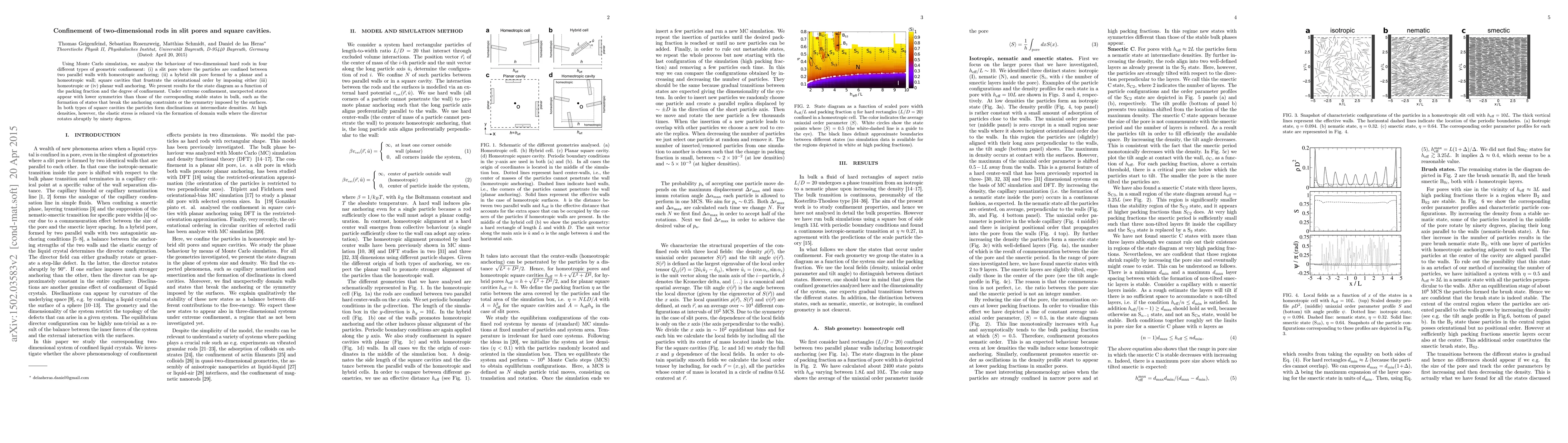 This paper uses Monte Carlo simulations to study the behavior of two-dimensional hard rods in various confined geometries, revealing unexpected low-symmetry states under extreme confinement and the formation of disclinations and domain walls at different densities.