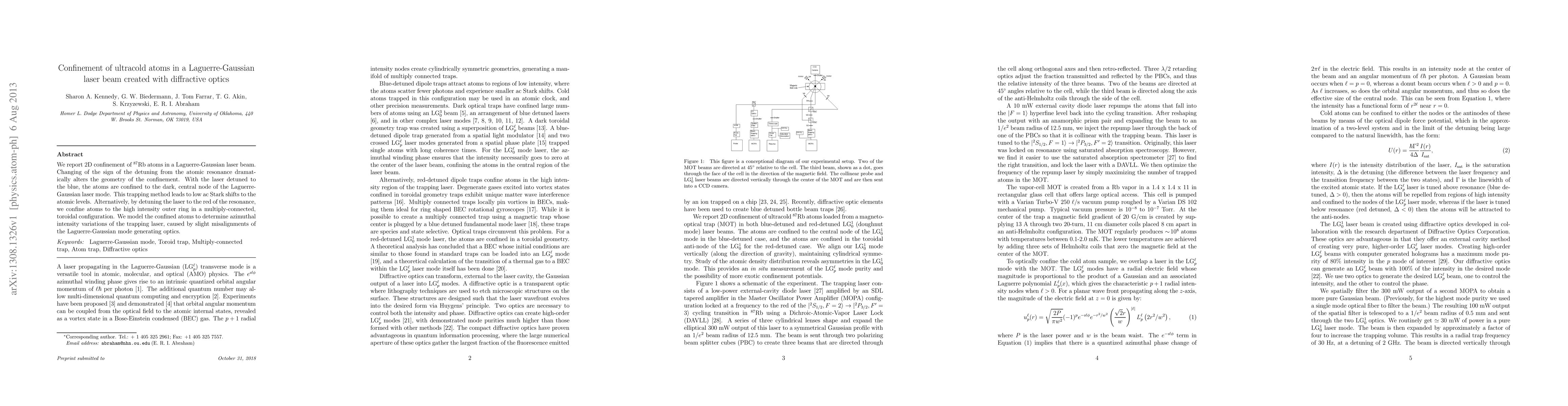 This paper reports on 2D confinement of Rb 87 atoms using a Laguerre-Gaussian laser beam, where the geometry of confinement changes with detuning. Atoms are trapped at the dark central node when blue-detuned, and in a toroidal configuration when red-detuned, demonstrating low ac Stark shifts and modeling effects of misalignments.