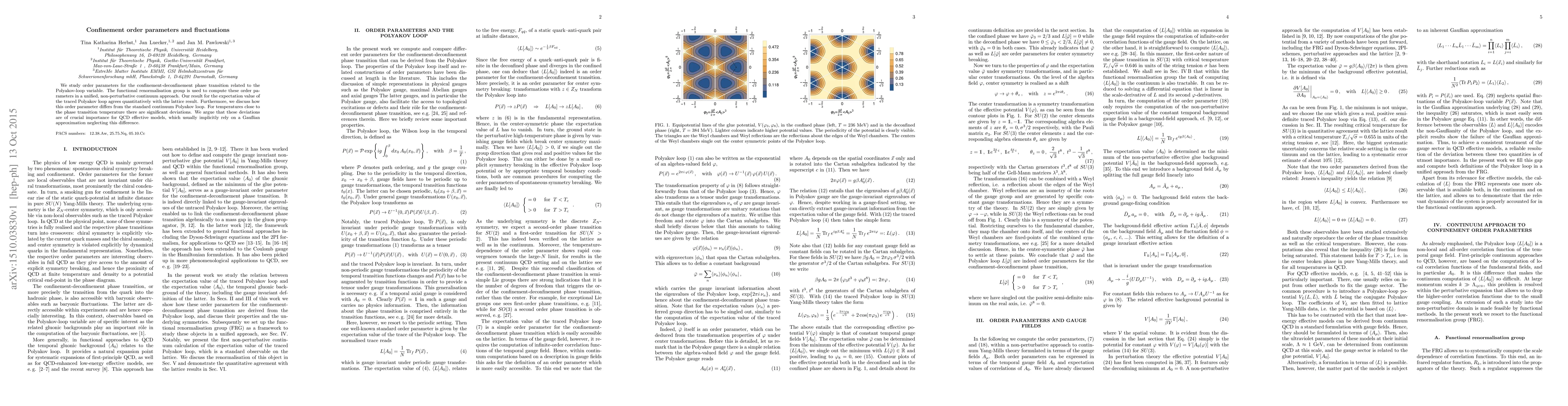 We study order parameters for the confinement-deconfinement phase transition related to the Polyakov-loop variable. The functional renormalisation group is used to compute these order parameters in a unified, non-perturbative continuum approach. Our result for the expectation value of the traced Polyakov loop agrees quantitatively with the lattice result. Furthermore, we discuss how this order parameter differs from the standard continuum Polyakov loop. For temperatures close to the phase transition temperature there are significant deviations. We argue that these deviations are of crucial importance for QCD effective models, which usually implicitly rely on a Gaussian approximation neglecting this difference.